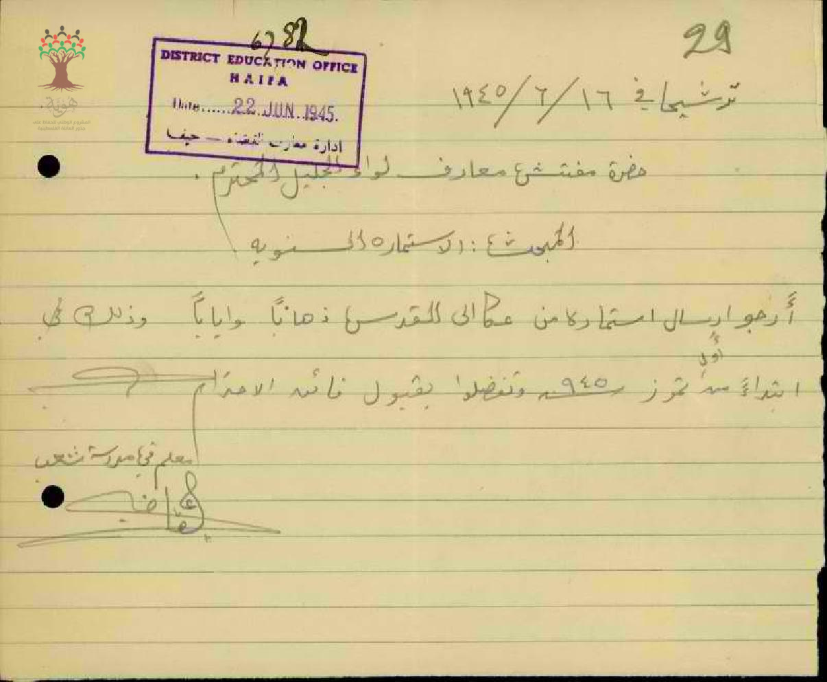 رسالة من المعلم علي القاضي إلى مفتش المعارف يطلب ارسال الاستمارة السنوية