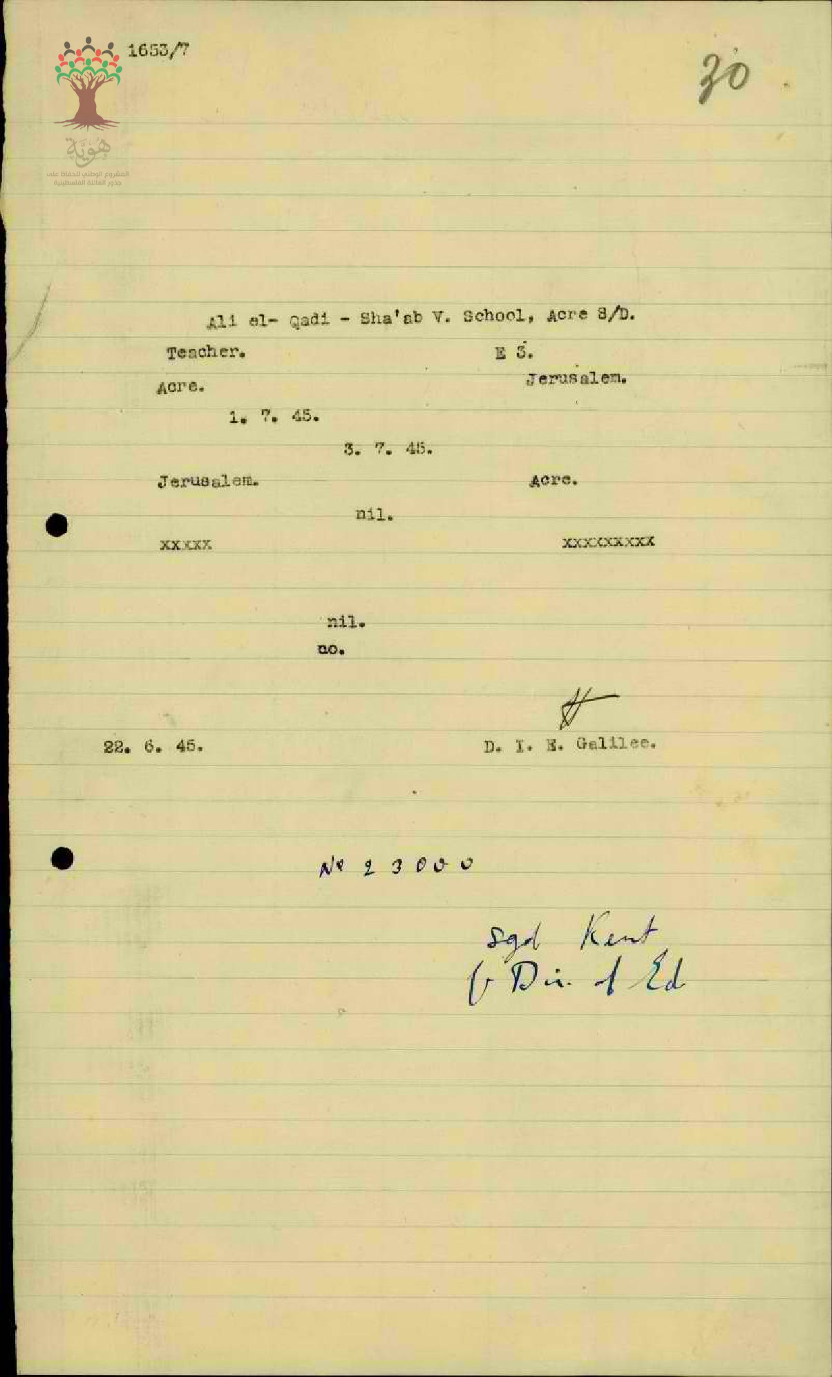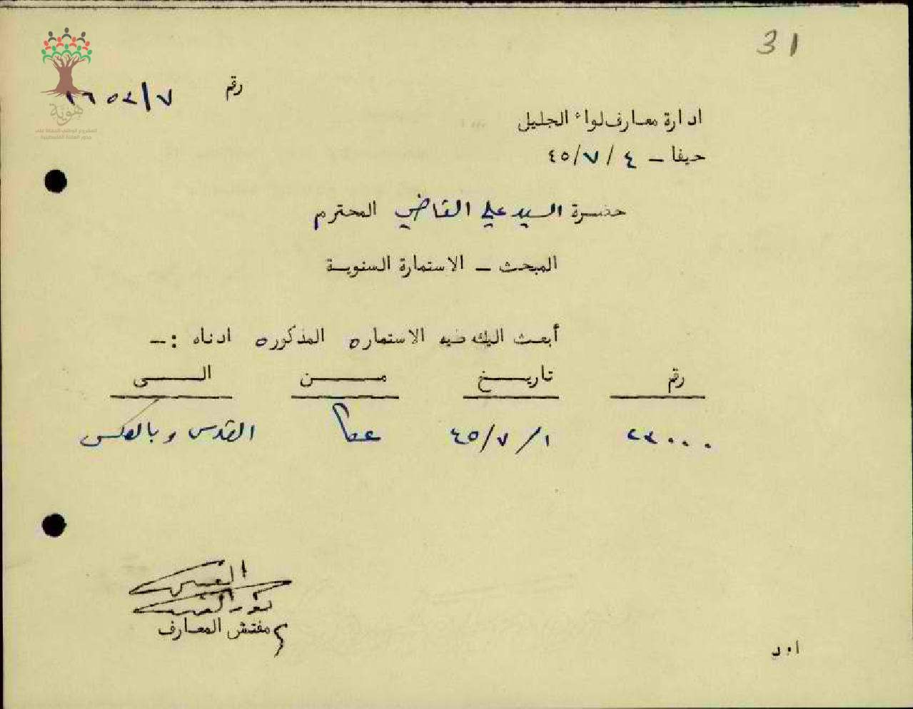 رسالة من مفتش المعارف إلى المعلم علي القاضي يخبره بإرسال الاستمارة السنوية