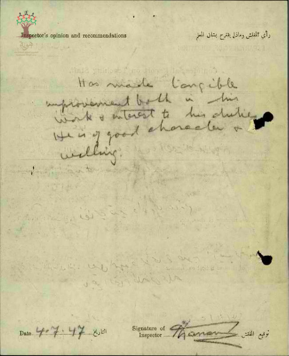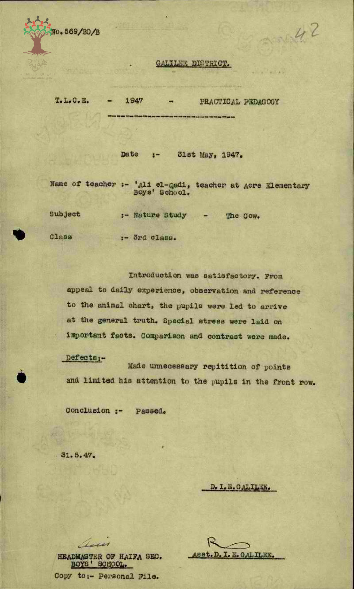 تقرير تفصيلي عن أداء المعلم علي القاضي في مدرسة عكا الابتدائية