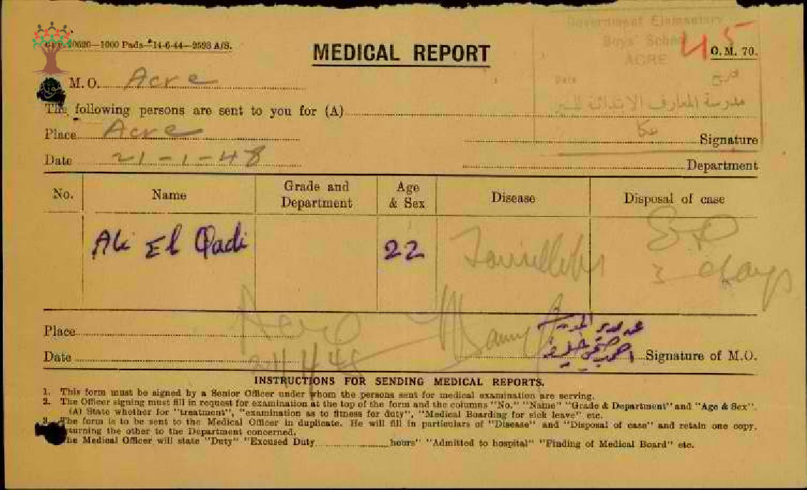 رسالة من مدير مدرسة عكا الابتدائية إلى مفتش المعارف يخبره بعودة المعلم علي القاضي إلى العمل بعد غياب مرفقا التقرير الطبي
