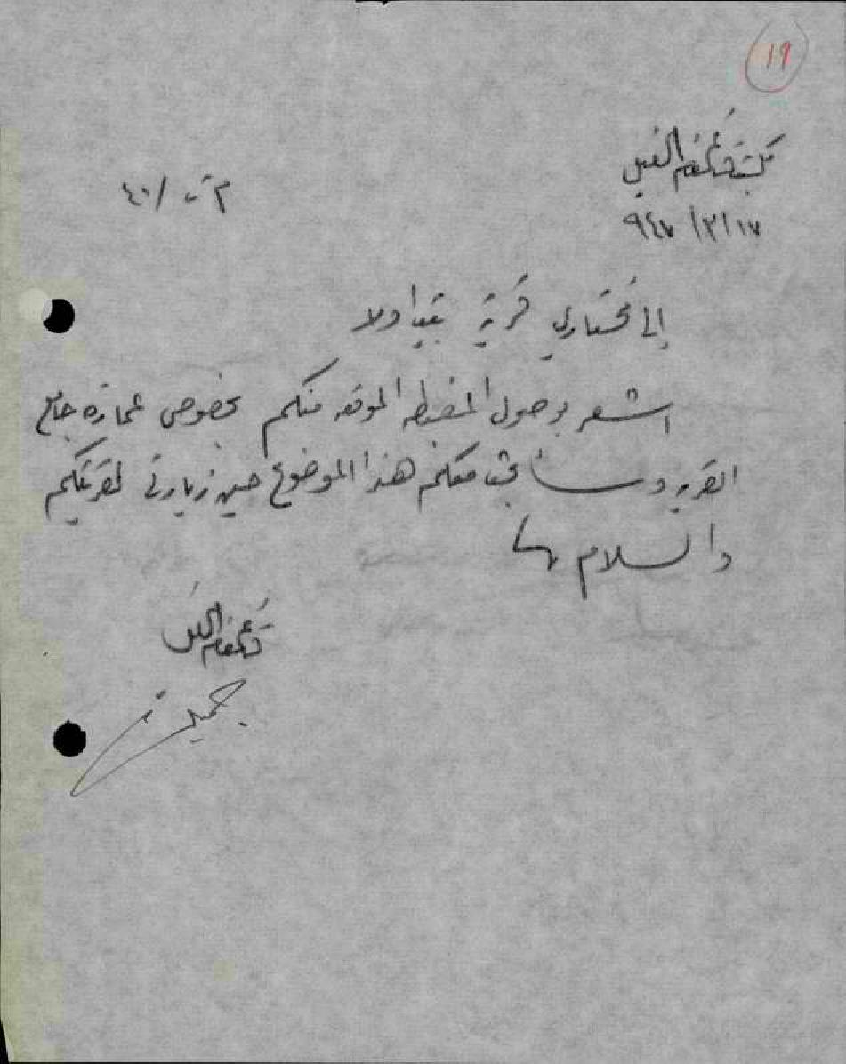 مختارو قرية بيت أولا يطلبون من قائممقام قضاء الخليل بناء جامع للقرية، والقائممقام يرد بأنه سيبحث الموضوع معهم عند زيارته للقرية