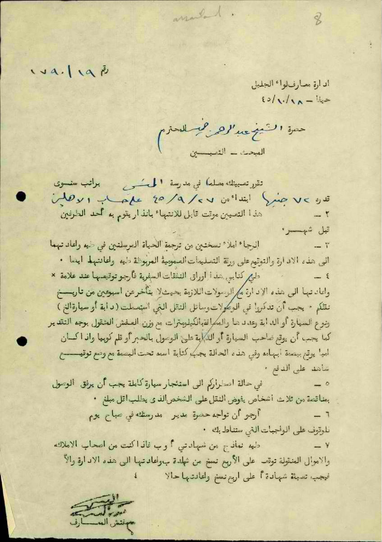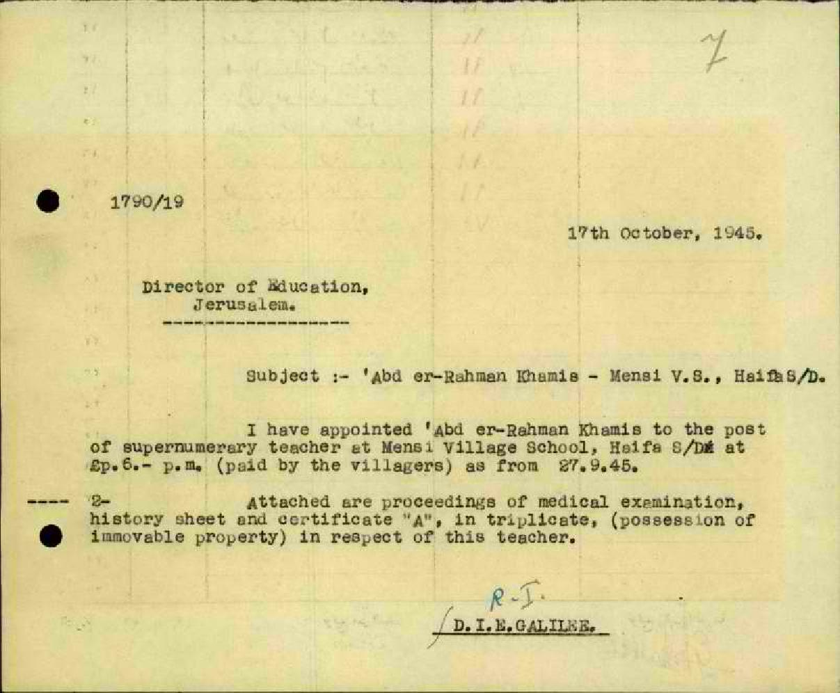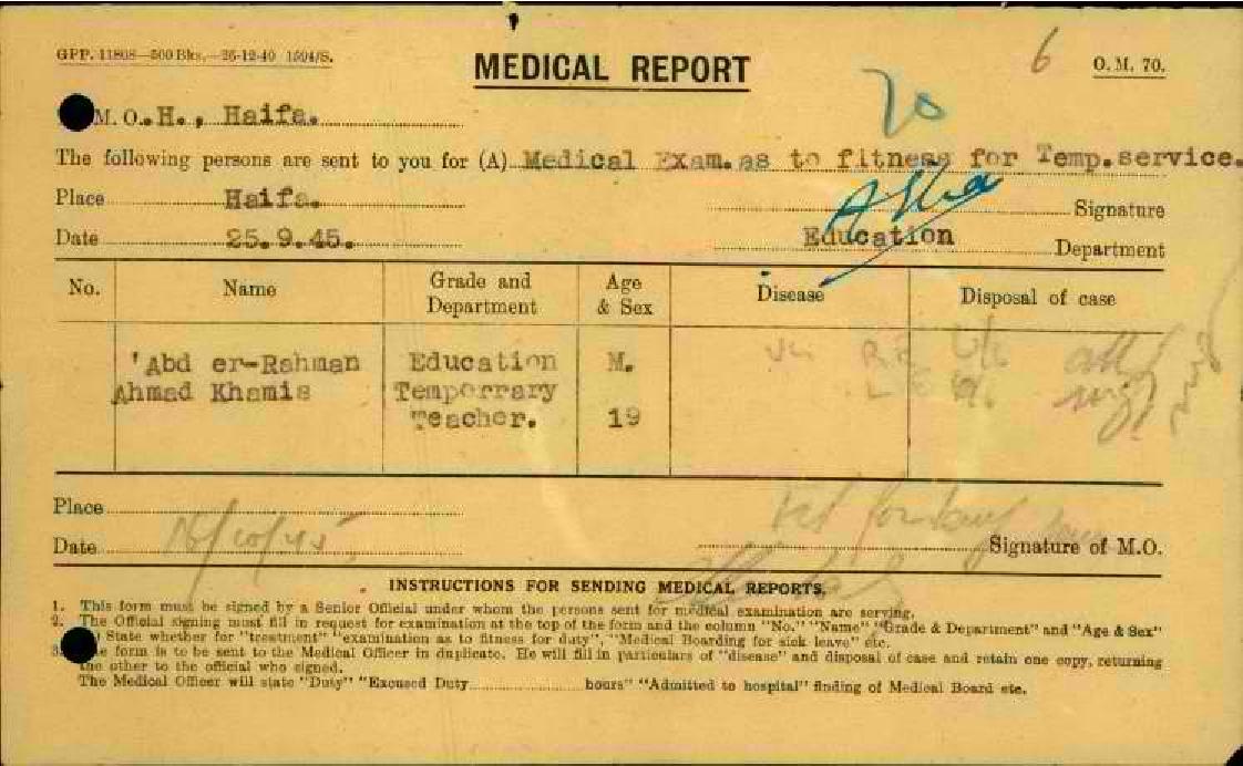 رسالة من مفتش المعارف إلى إدارة المعارف يخبر بتعيين المعلم عبد الرحمن أحمد خميس (غزاوي)مرفقا التقرير الطبي للمعلم