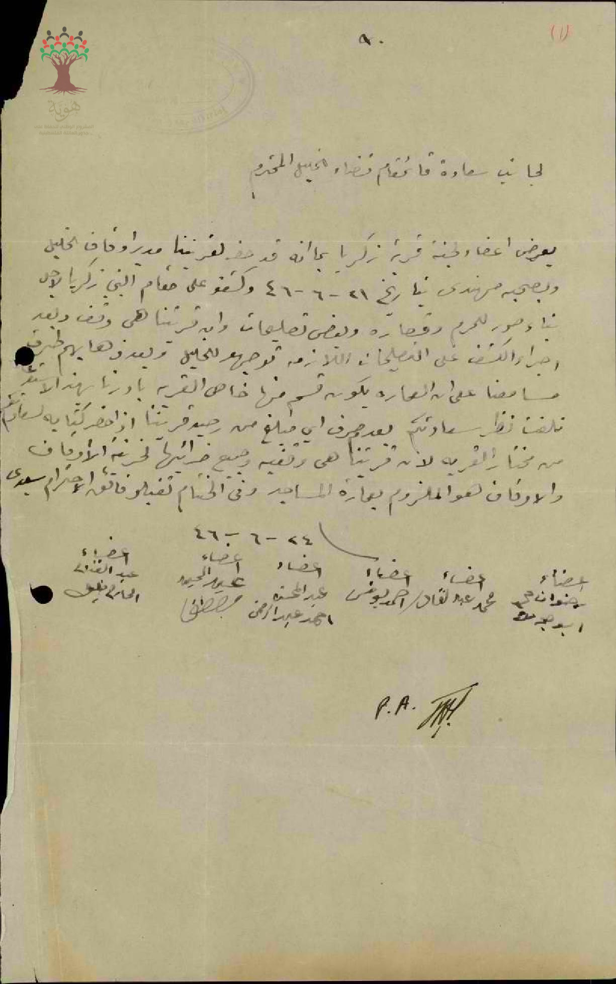 رسالة من لجنة قرية زكريا توضح لقائممقام الخليل أن الصرف على عمارة المسجد يكون من الأوقاف لأنه قرية وقفية وذلك بعدما بلغ مسامعهم أن جزءاً من تكاليف الإصلاحات ستكون من صندوق القرية