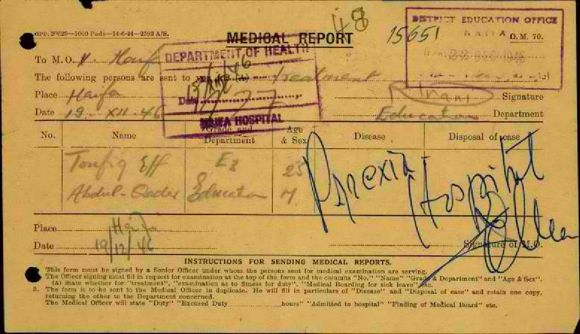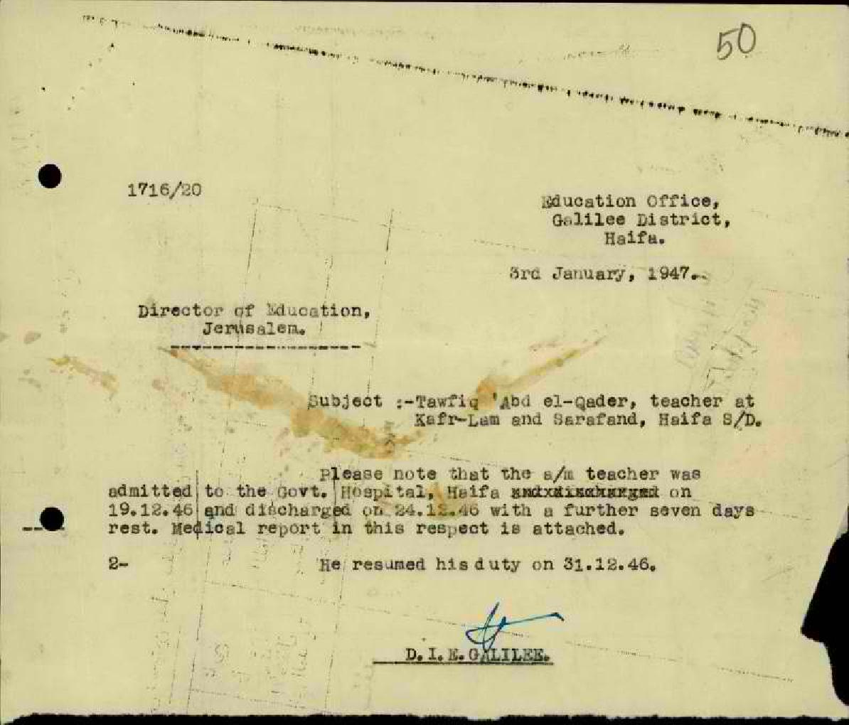 رسالة من المعلم توفيق عبد القادر إلى مفتش المعارف يخبره عن أسباب غيابه مرفقا التقرير الطبي
