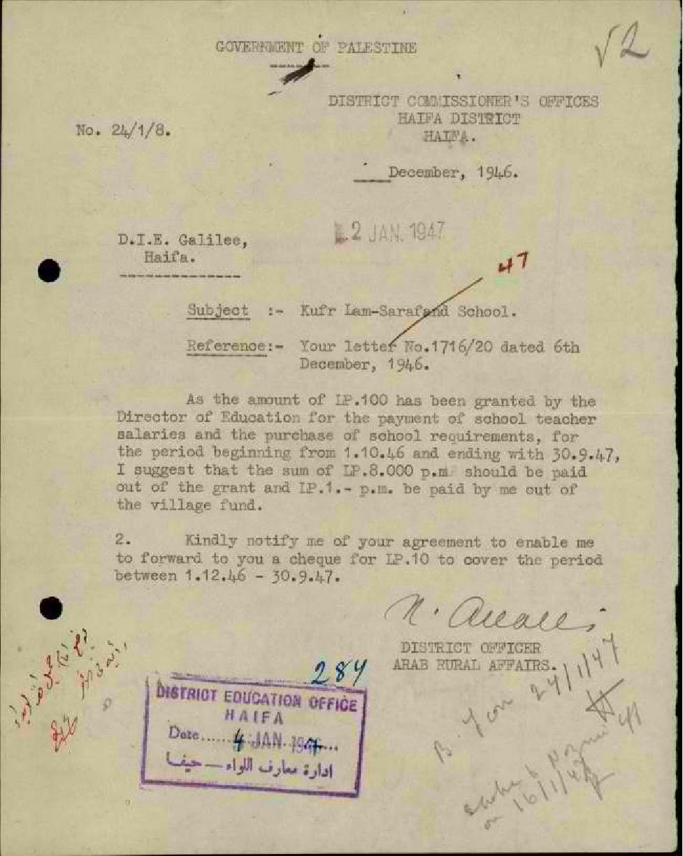 رسالة من مفتش المعارف إلى المعلم توفيق عبد القادر يخبره أن القائمقام يطلب منه مبلغ جنيه ضريبة تحسين القرى