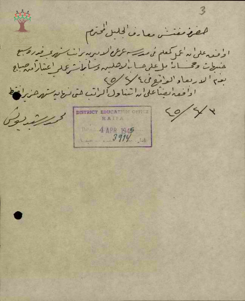 موافقة المعلم محمد رشيد يونس على العمل كمعلم في مدرسة عرعرة