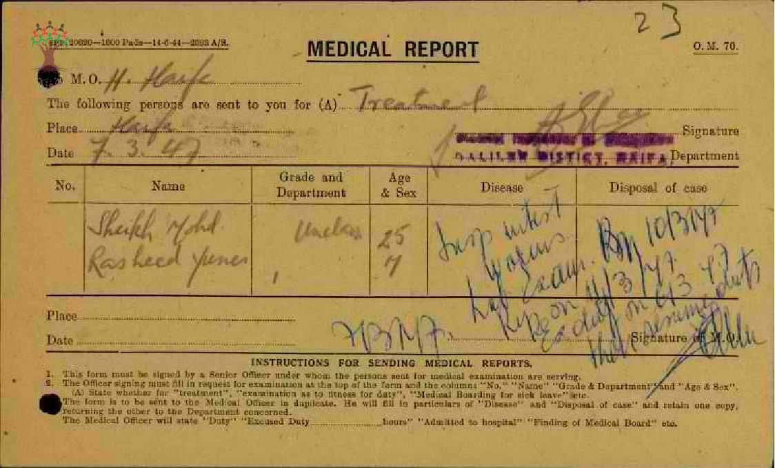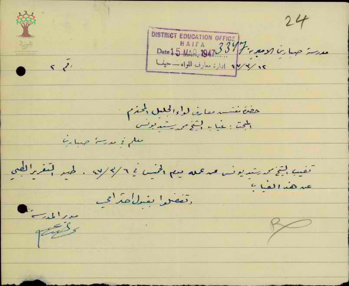 رسالة من مدير مدرسة صبارين إلى مفتش المعارف يبحث معه غياب المعلم محمد رشيد يونس مرفقاً التقرير الطبي(12/3/1947)