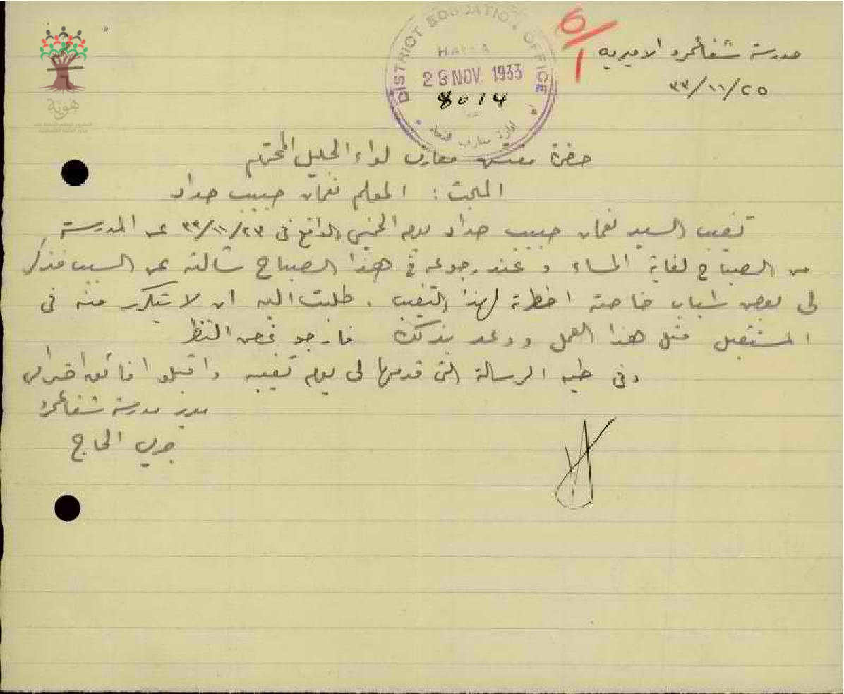 رسالة من مدير مدرسة شفا عمرو إلى مفتش المعارف يبحث معه تغيب المعلم نعمان حبيب حداد