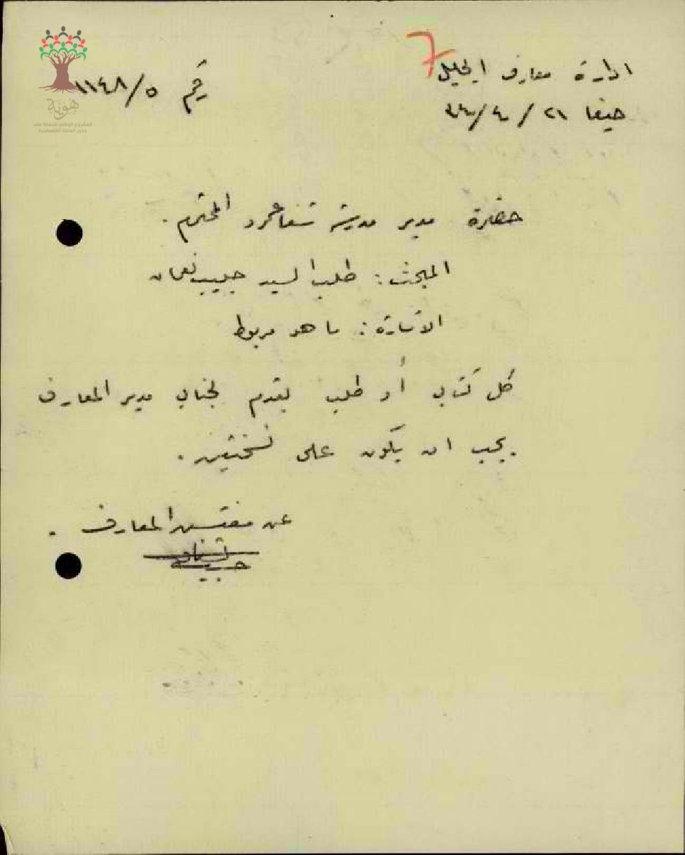 رسالة من مفتش المعارف إلى المعلم نعمان حبيب حداد يطلب منه أن يقدم نسختين عن كل طلب