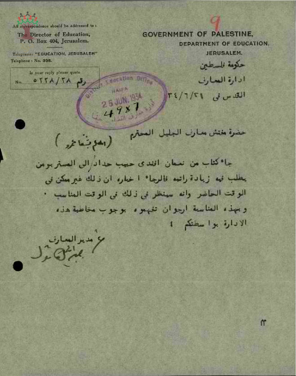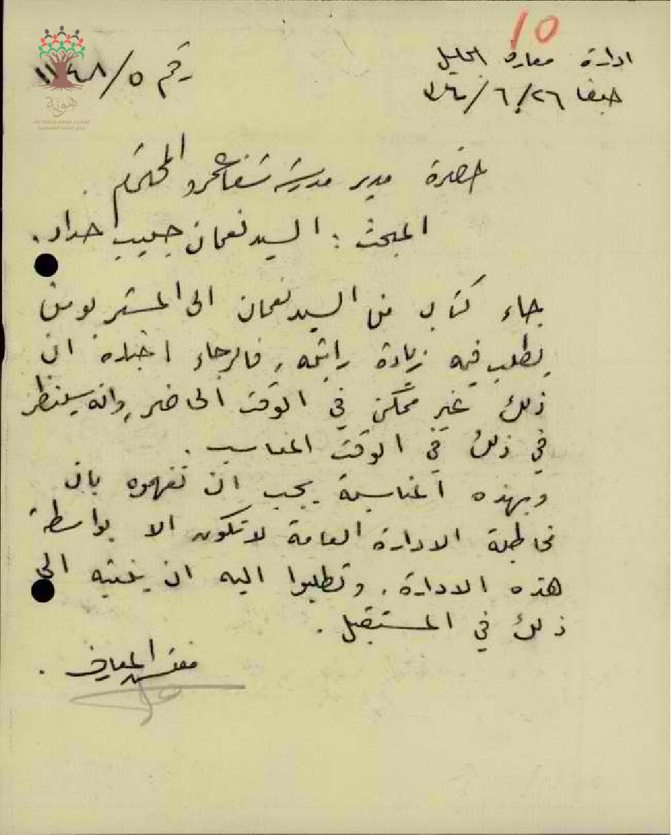 رسالة من مدير المعارف إلى مفتش المعارف يبحث معه طلب المعلم نعمان حبيب حداد زيادة راتبه وأخبره بأنه غير ممكن في الوقت الحالي