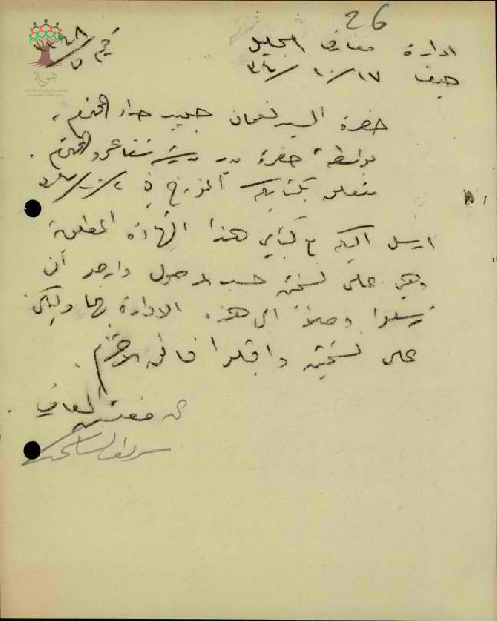 رسالة من مدير المعارف إلى مفتش المعارف يرفق فيها شهادة للمعلم نعمان حبيب حداد