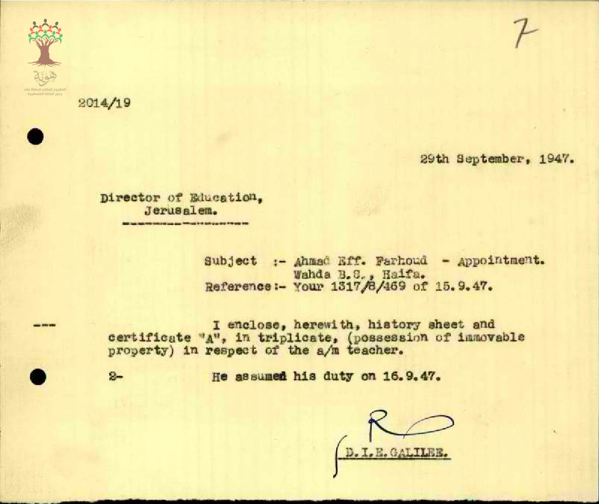 رسالة من مفتش المعارف إلى مدير المعارف يبحث معه تعيين المعلم أحمد فرهود في الادارة