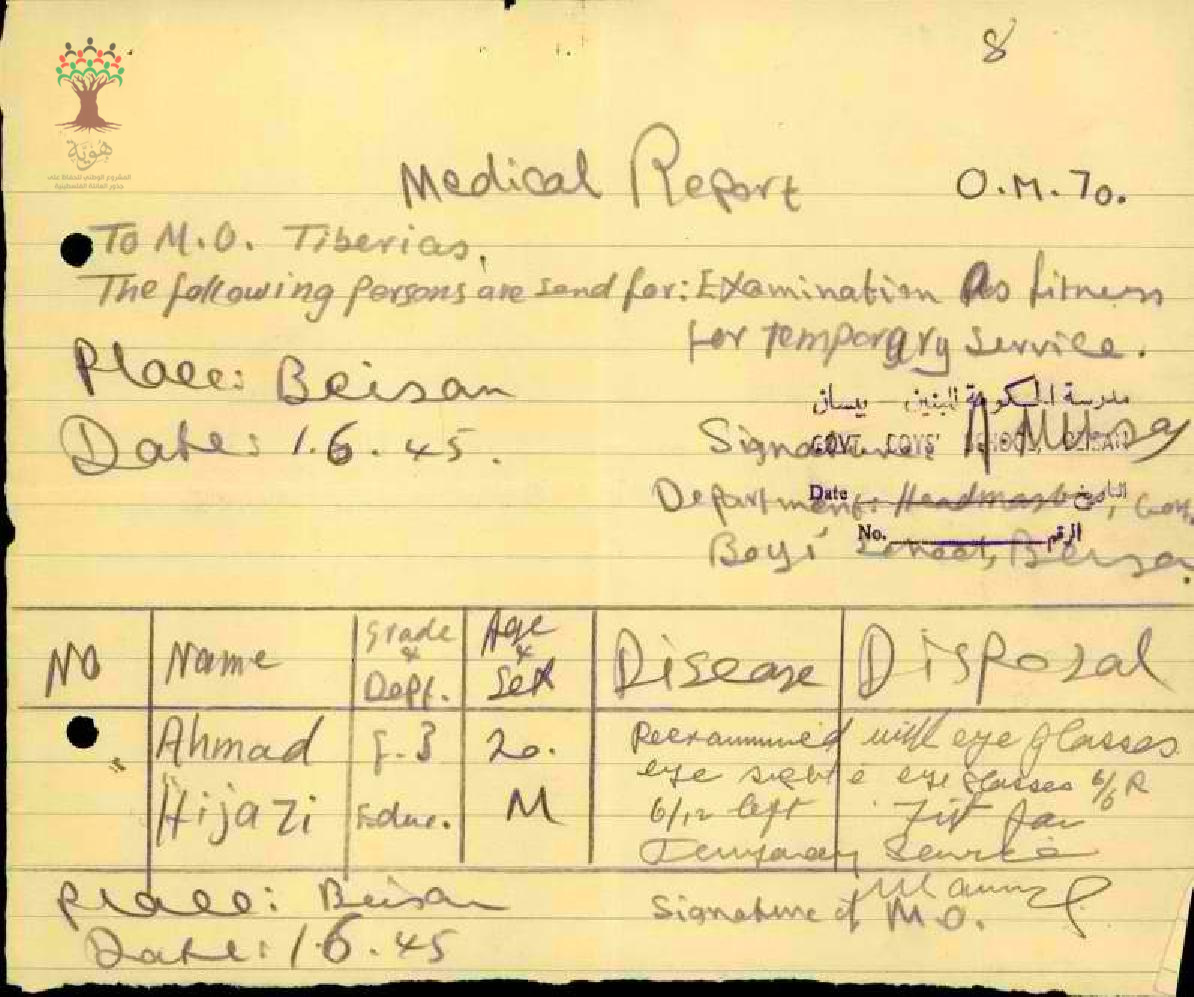 تقرير طبي لتوظيف المعلم أحمد حجازي في مدرسة عكا