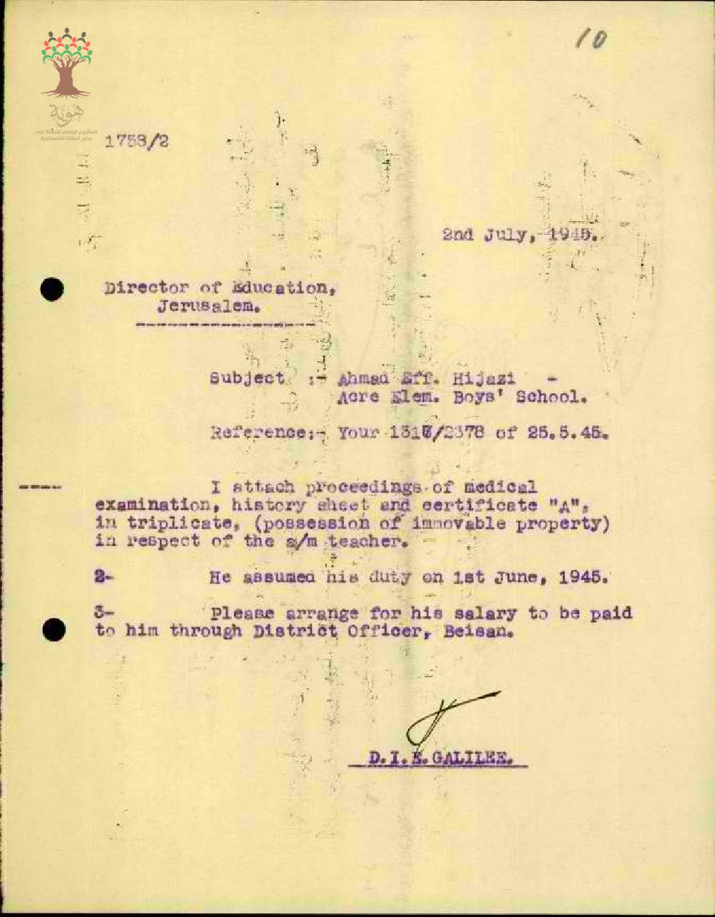رسالة من مدير المعارف إلى مفتش المعارف يبحث معه تعيين المعلم أحمد حجازي