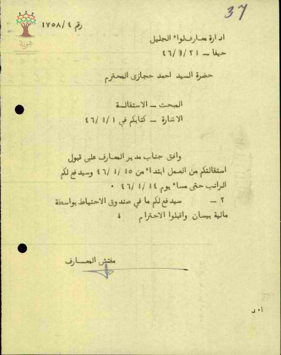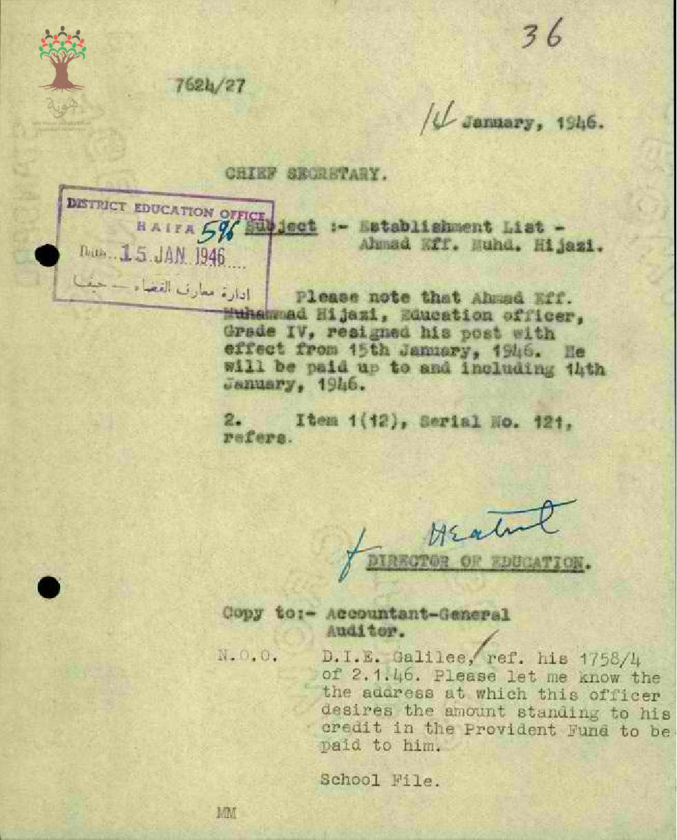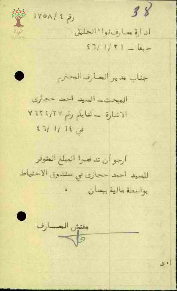 رسالة من مفتش المعارف إلى المعلم أحمد حجازي يعلمه بقبول مدير المعارف الاستقالة ودفع المبلغ المتوفر للمعلم في صندوق الاحتياط