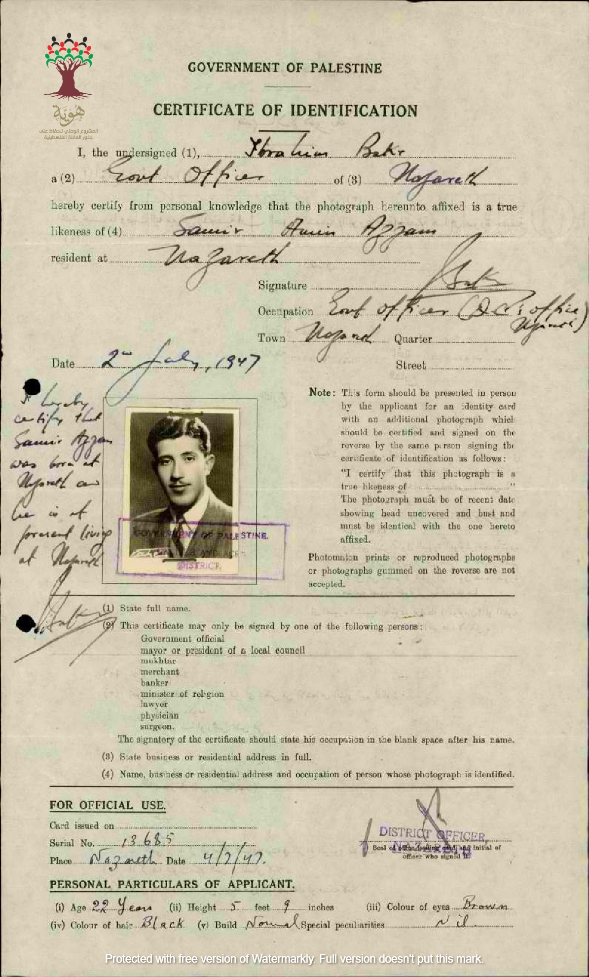 شهادة هوية سمير امين عزام - الناصرة بتوقيع ابراهيم بكر عام 1947