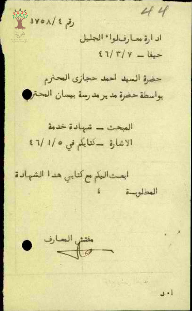 رسائل من إدارة المعارف إلى المعلم أحمد حجازي بخصوص شهادة الخدمة