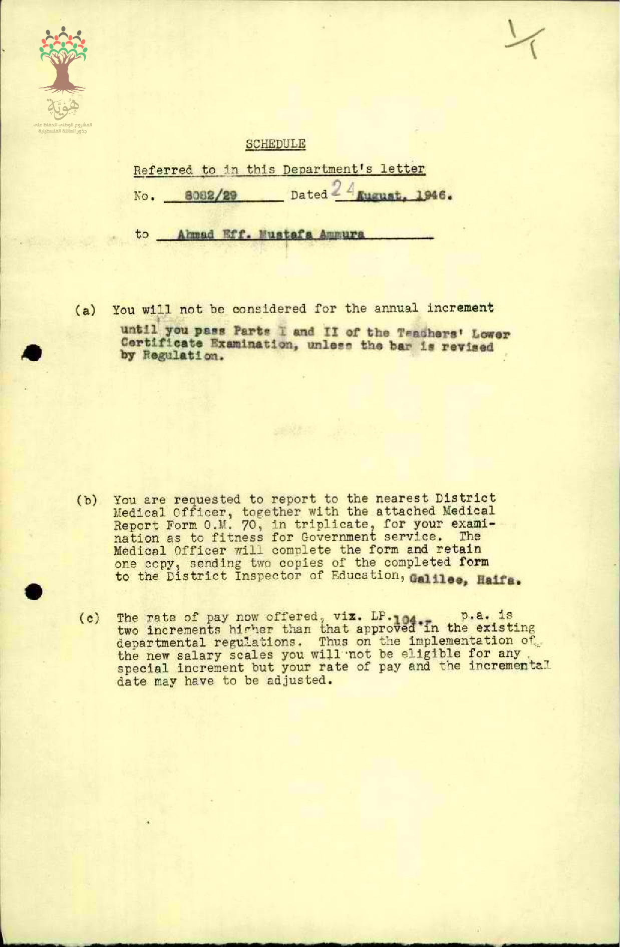رسالة تعيين للمعلم أحمد مصطفى عمورة في إدارة المعارف