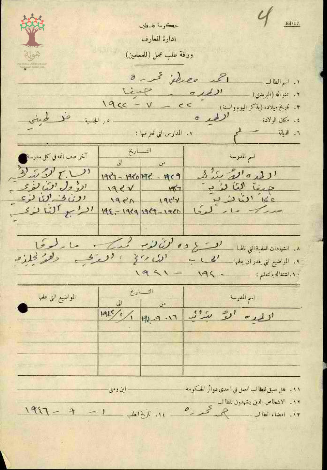 ورقة طلب عمل للمعلم أغحمد مصطفى عمورة / الطيرة