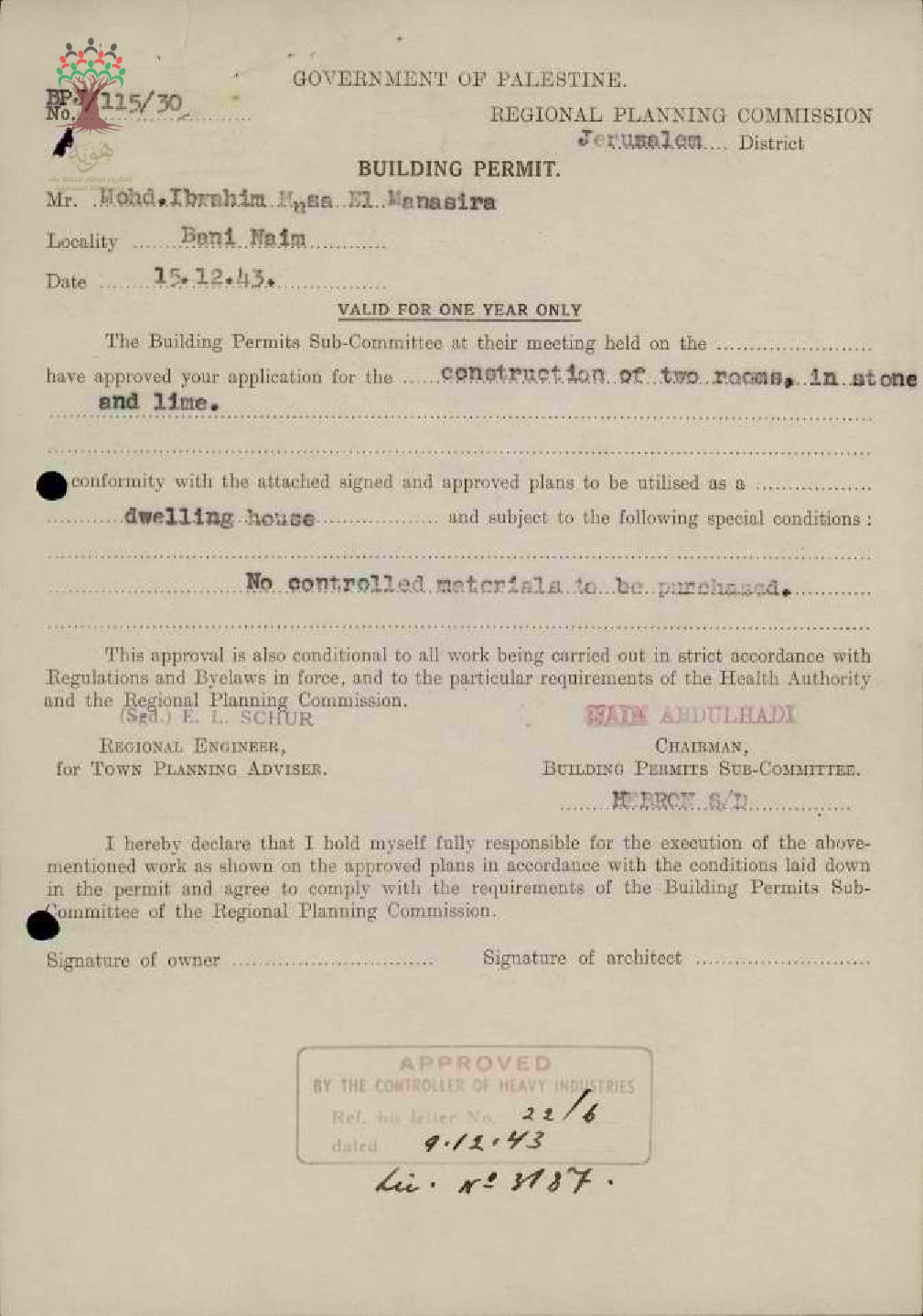 رخصة بناء في بني نعيم-محمد إبراهيم موسى المناصرة