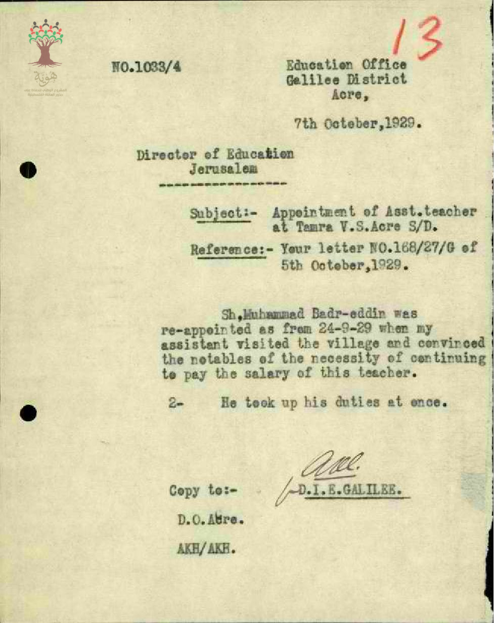 رسالة من مفتش المعارف إلى مدير المعارف يبحث معه تعيين المعلم محمد بدر الدين ذياب في مدرسة طمرة وضرورة دفع راتبه