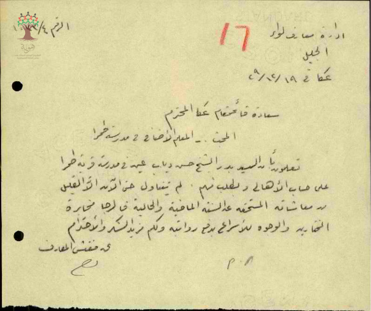 رسالة من مفتش المعارف إلى قائمقام عكا يبحث معه أمر دفع الاهالي راتب المعلم محمد بدر الدين ذياب