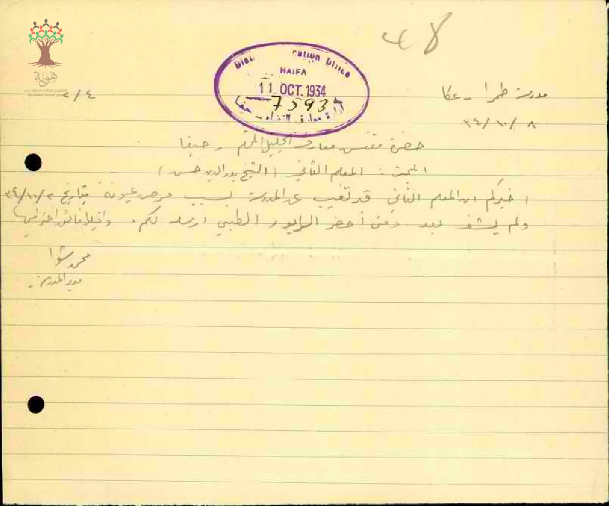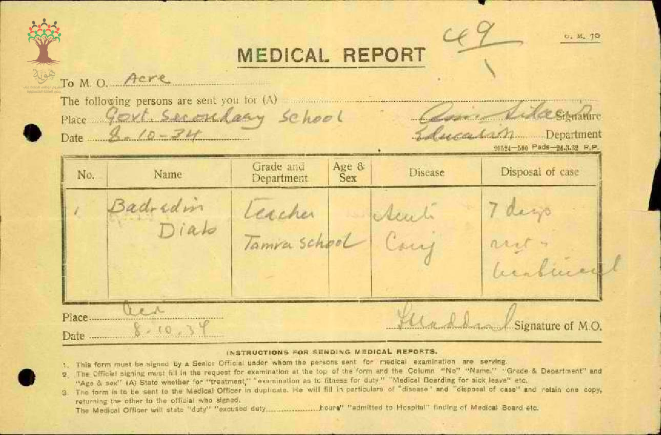 رسالة من مدير مدرسة طمرة إلى مفتش المعارف يخبره عن تغيب المعلم محمد بدر الدين ذياب بسبب مرض عيونه مرفقاً التقرير الطبي