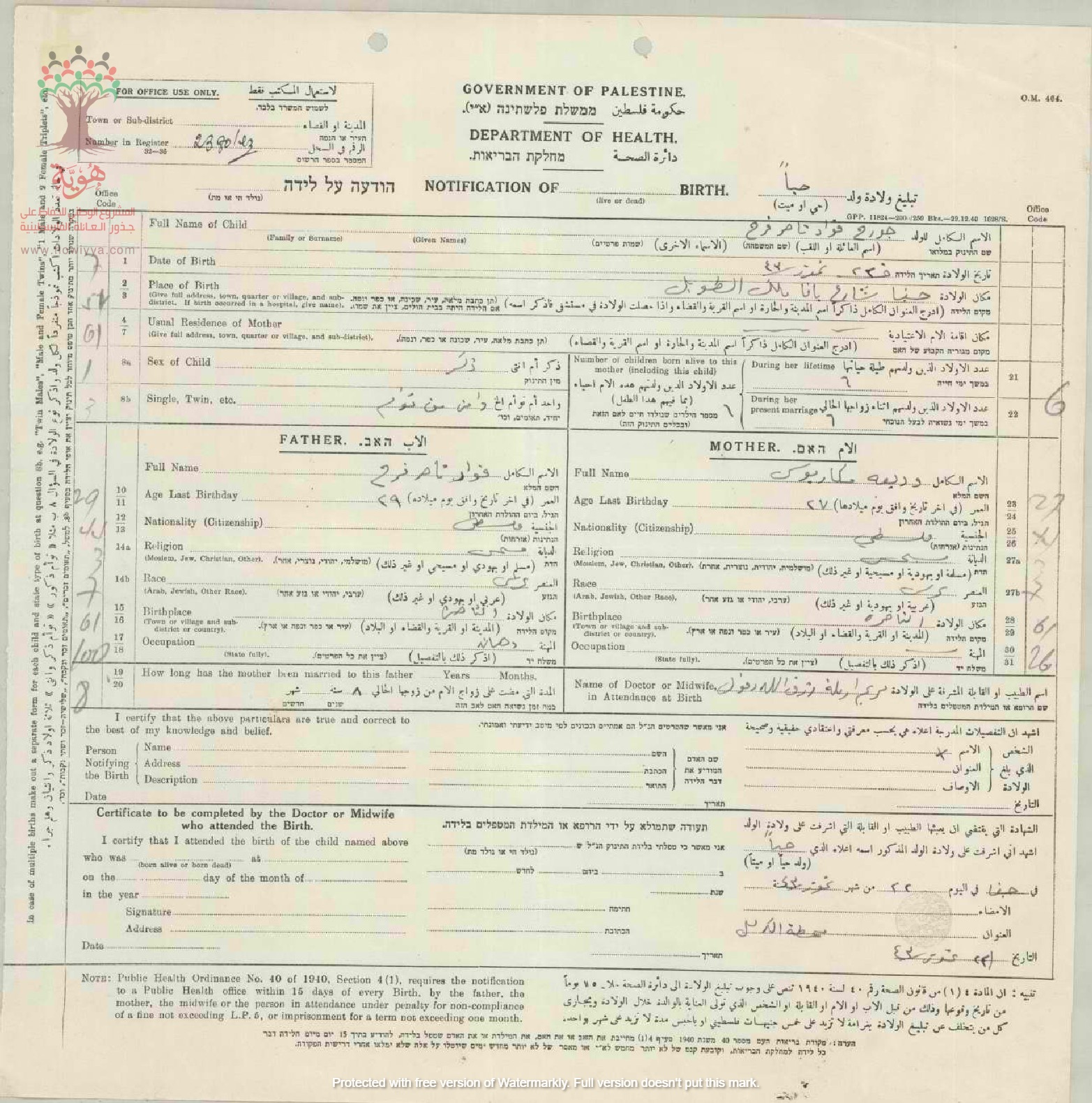 شهادة ميلاد جورج فؤاد ناصر فرح - الناصرة