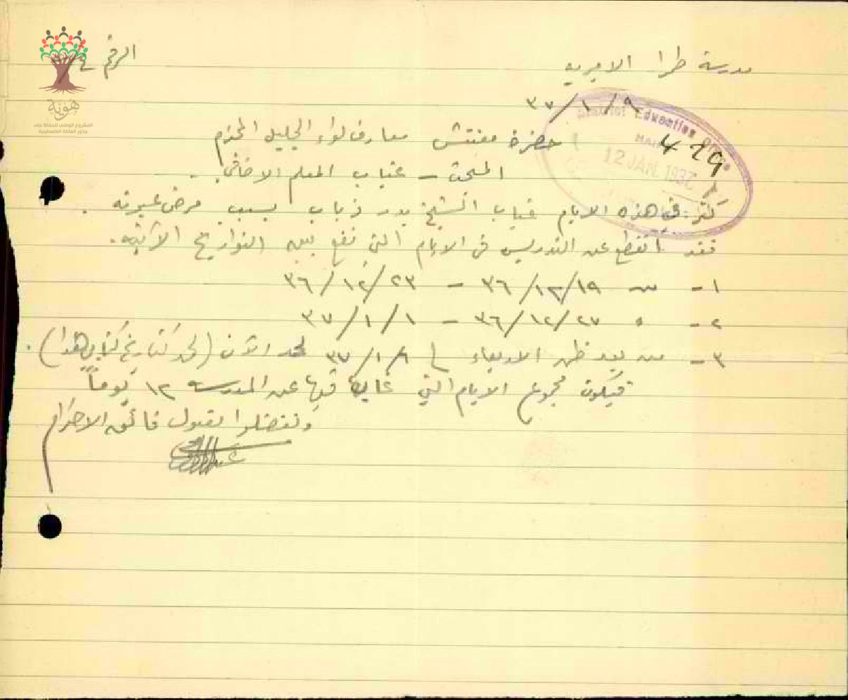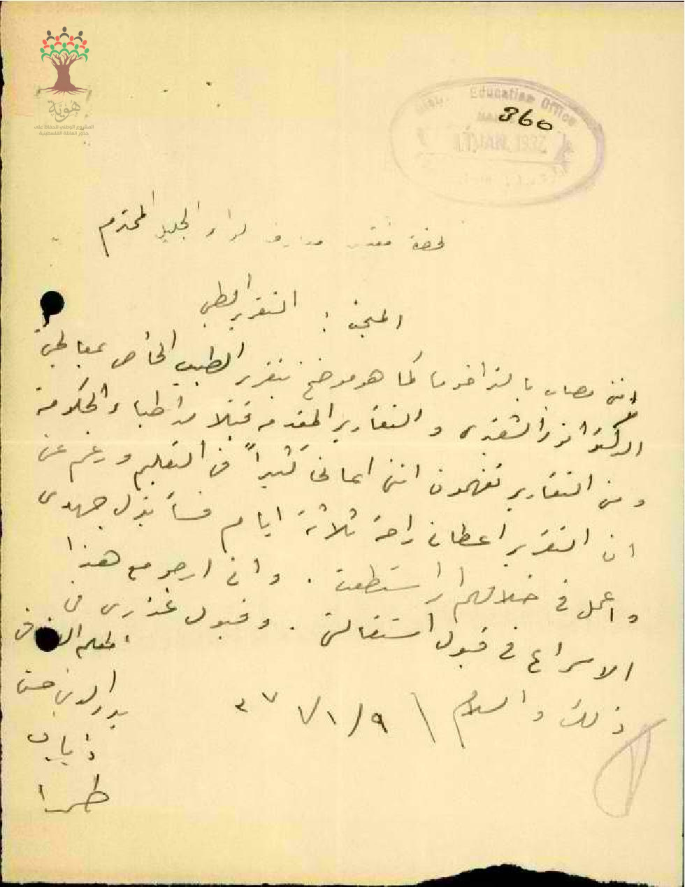 رسالة من مدير مدرسة طمرة إلى مفتش المعارف يبحث معه أمر غياب ومرض المعلم محمد بدر الدين ذياب مرفقاً التقارير الطبية