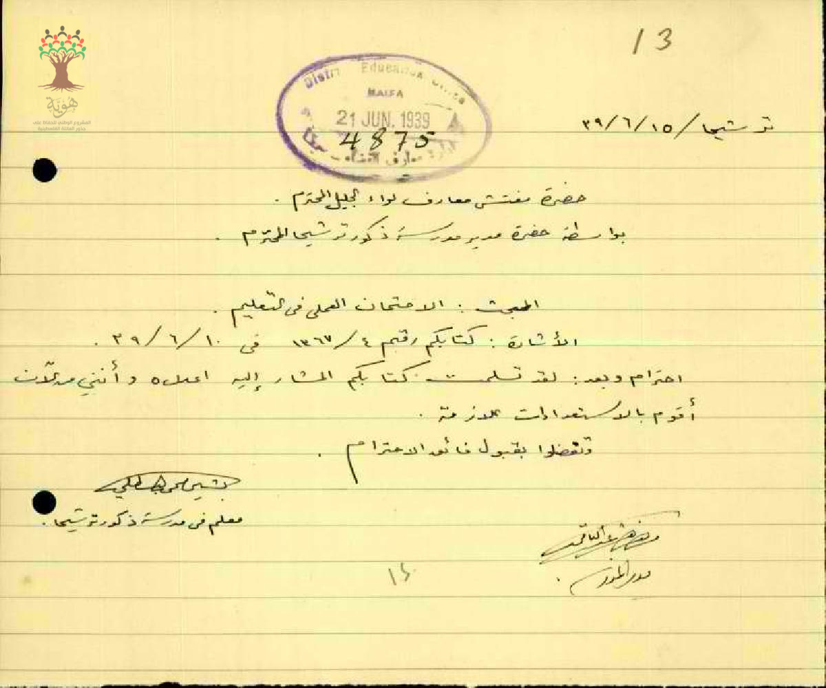 رسالة من المعلم بشير البسطامي إلى مفتش المعارف يخبره باستلام كتابه الذي يتعلق بالامتحان العملي في التعليم