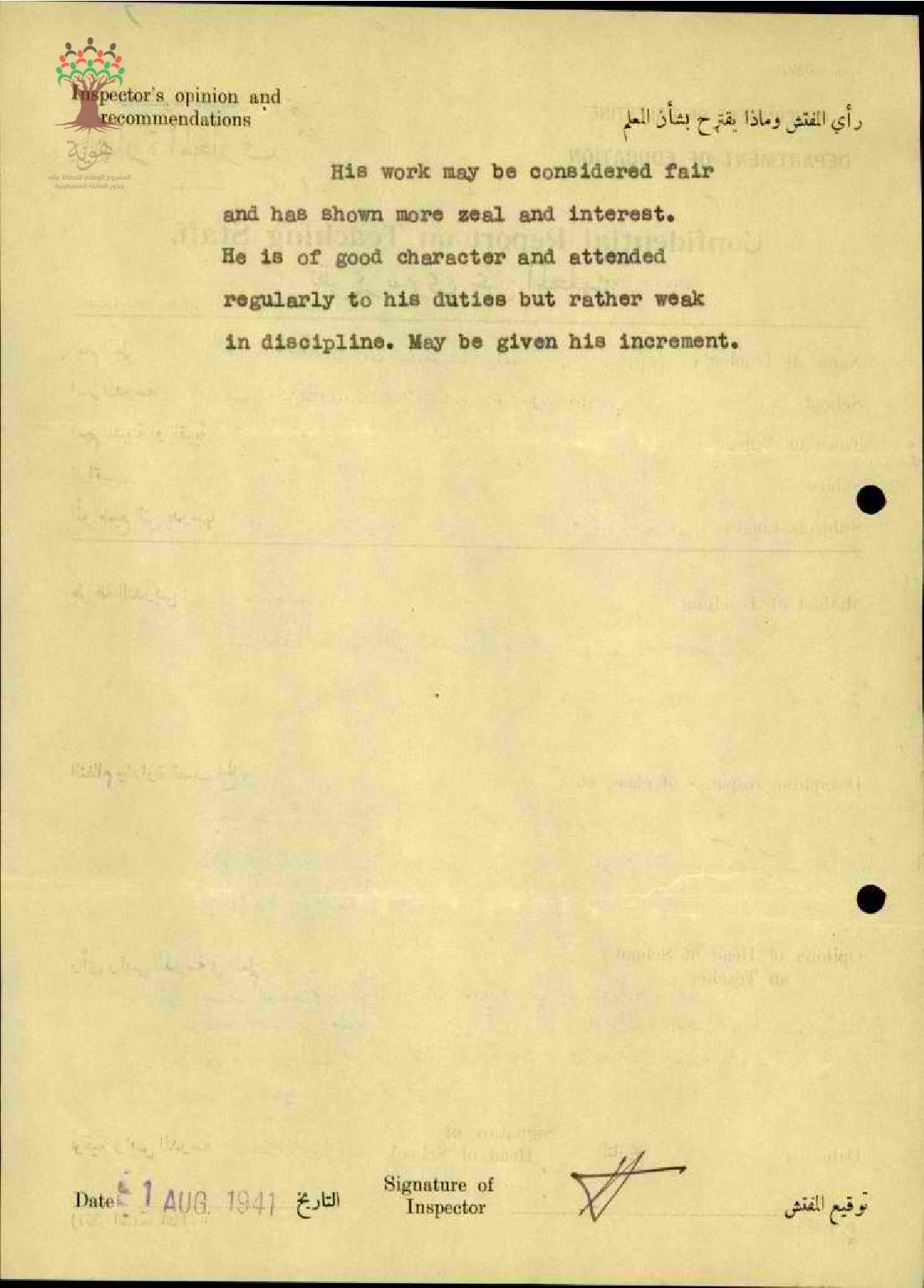 تقرير تفصيلي عن أداء المعلم بشير البسطامي في مدرسة ترشيحا سنة 1941