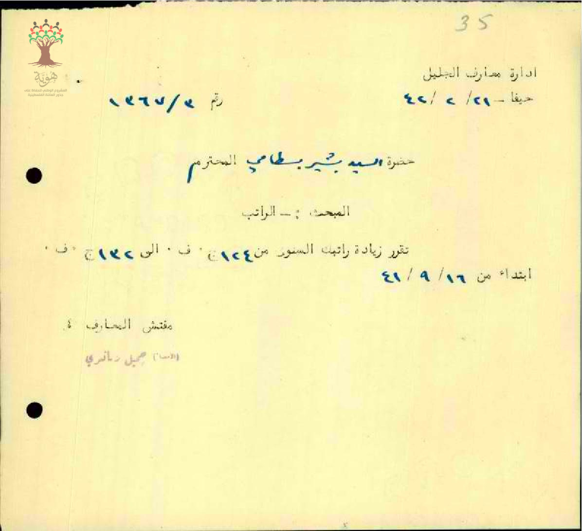 رسالة من مفتش المعارف إلى المعلم بشير البسطامي يخبره بزيادة راتبه السنوي
