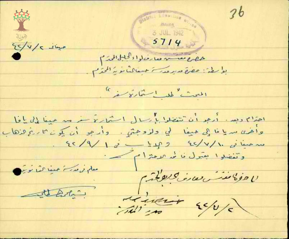 طلب استمارة سفر مقدم من المعلم بشير البسطامي إلى مفتش المعارف