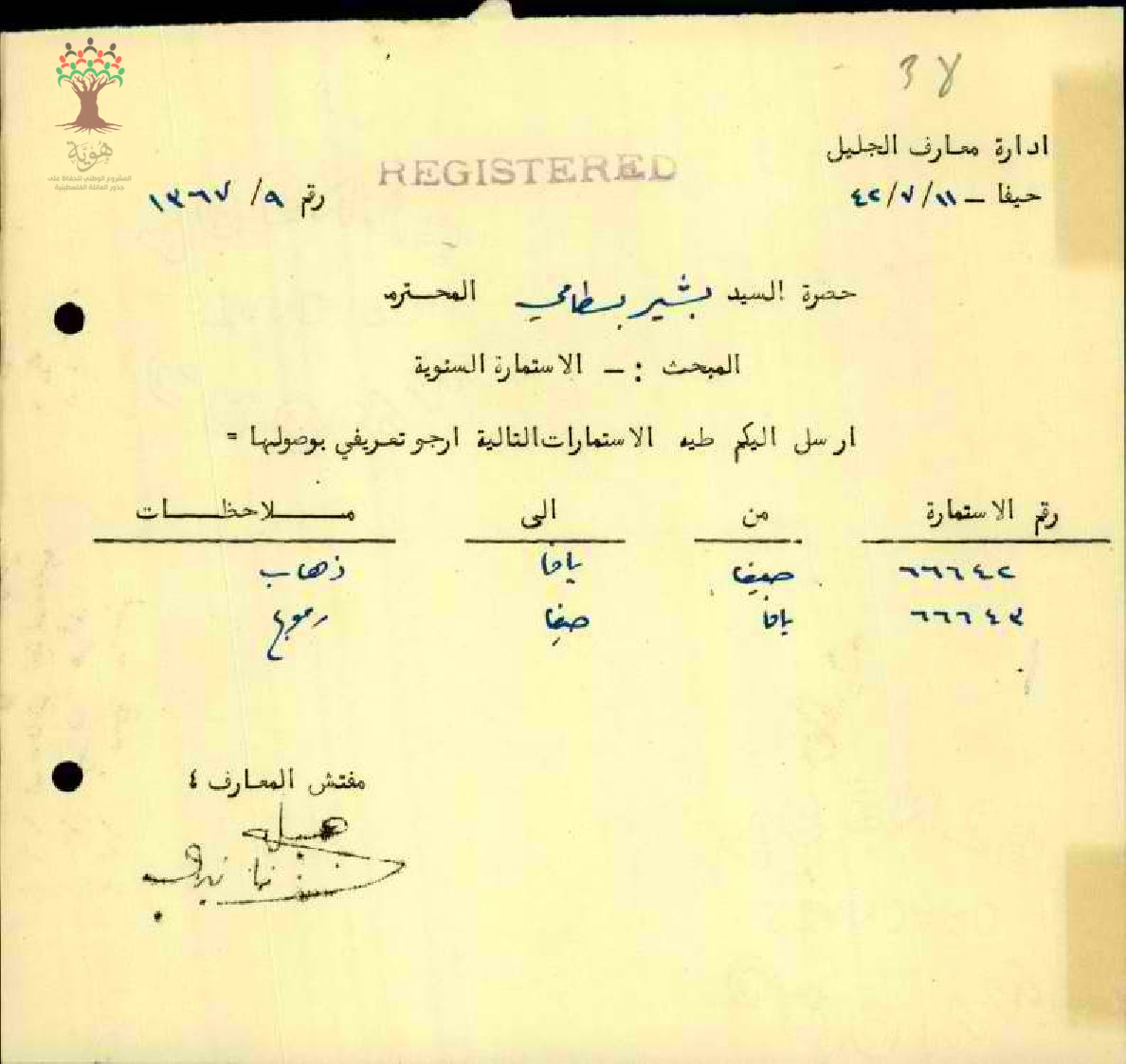 استمارة سفر مقدمة إلى المعلم بشير البسطامي / حيفا