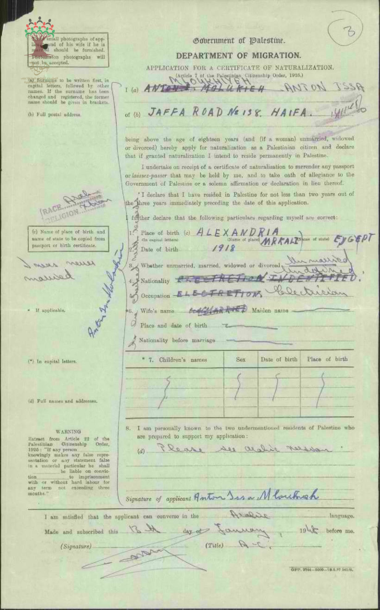 طلب الجنسية الفلسطينية-عيسى انطوان ملوخية-حيفا/مصر