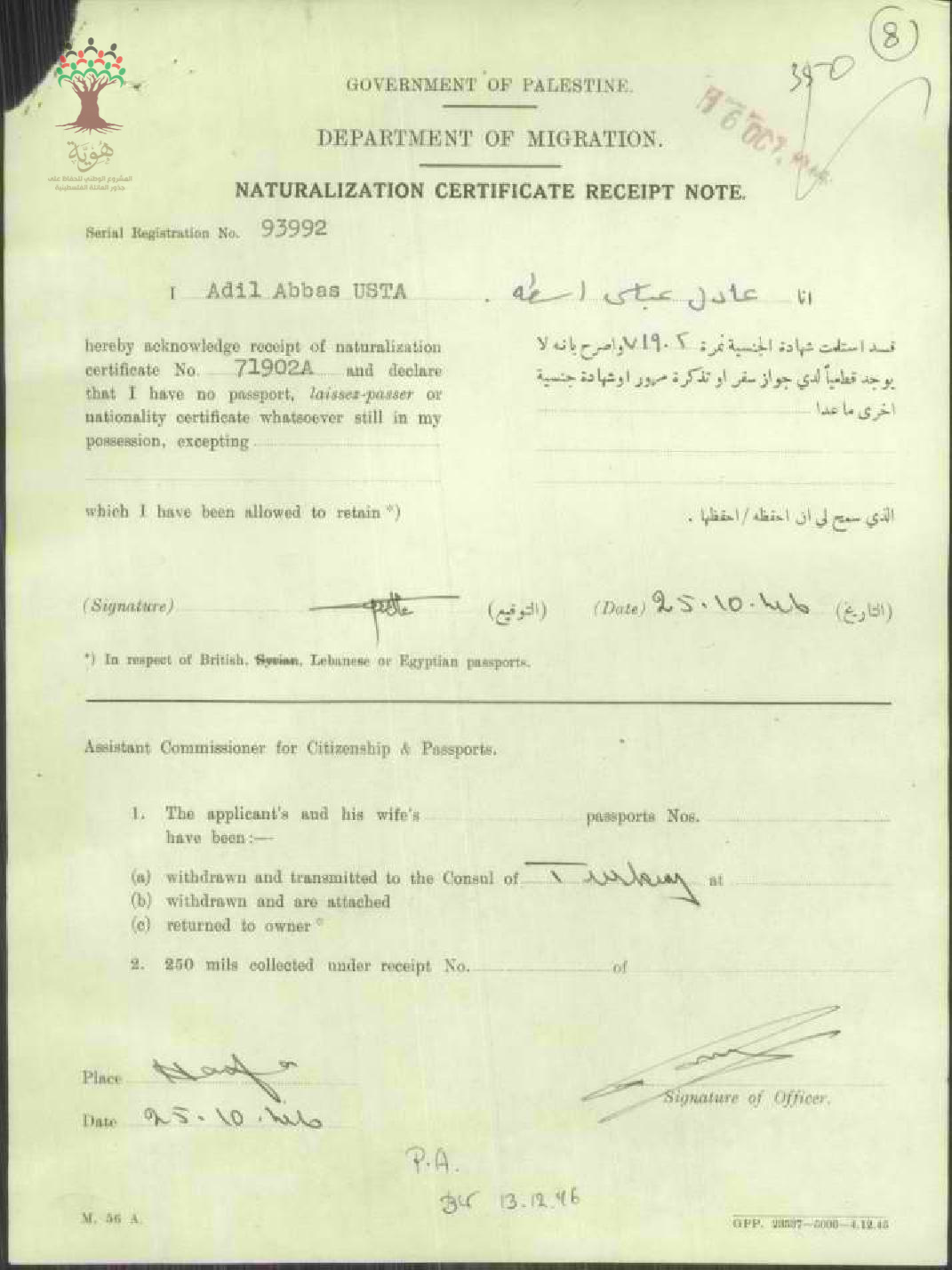إيصال موقع من عادل عباس أسطة باستلام شهادة الجنسية الفلسطينية