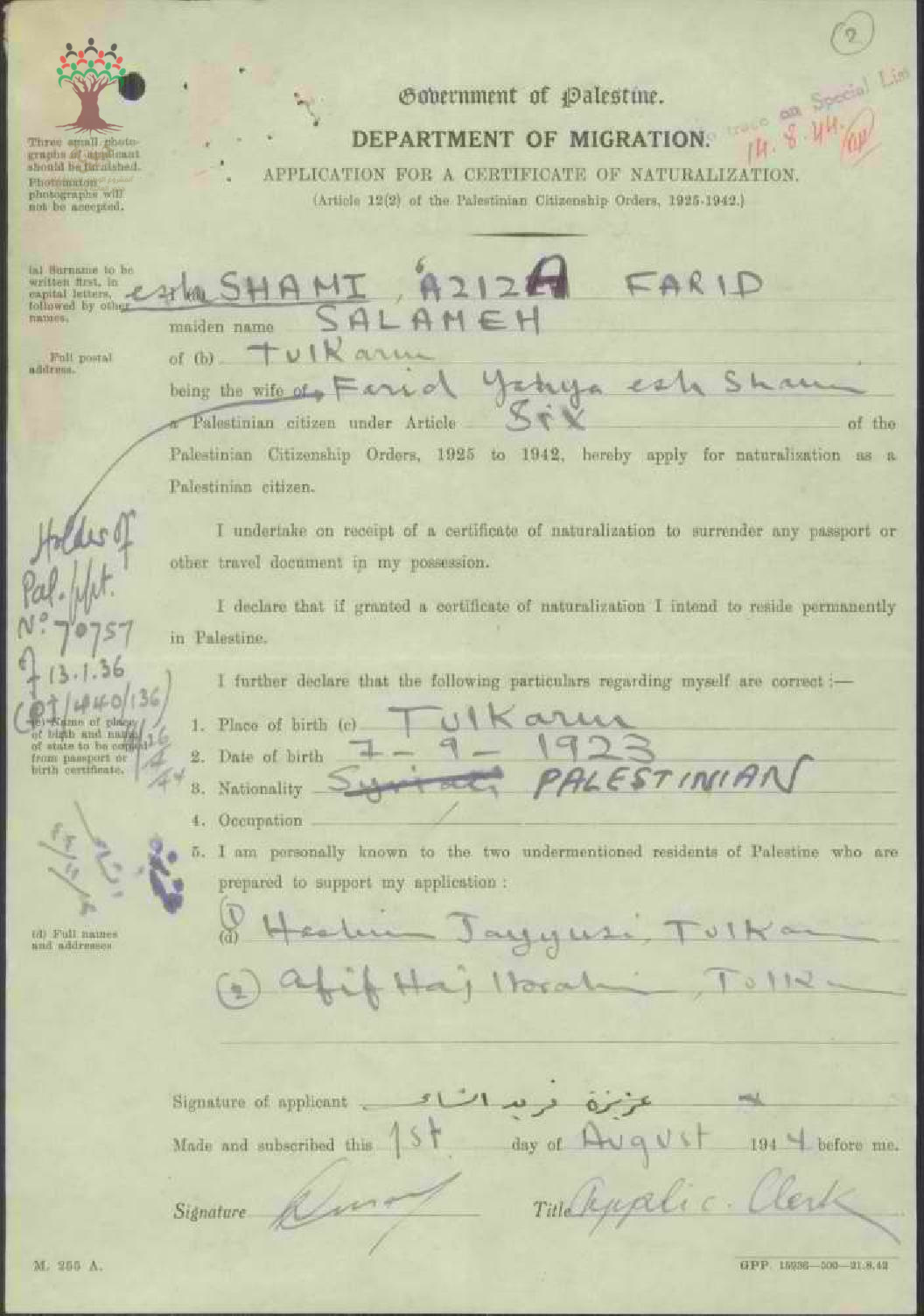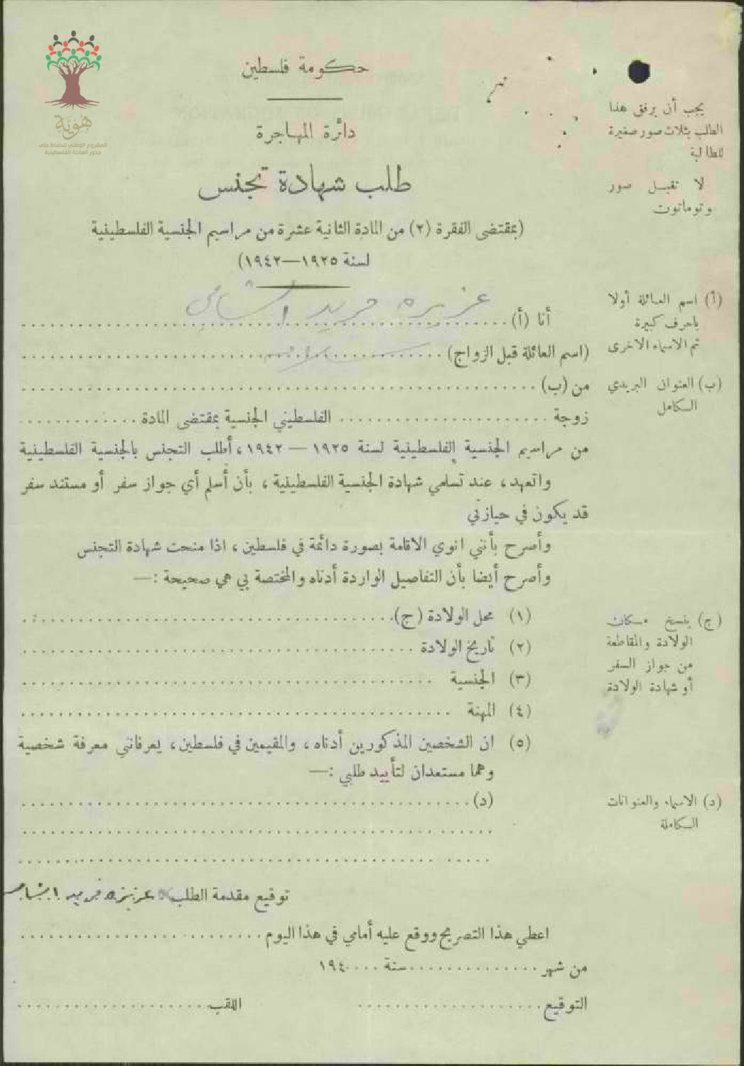 طلب الجنسية الفلسطينية-عزيزة فريد سلامة الشامي-طولكرم
