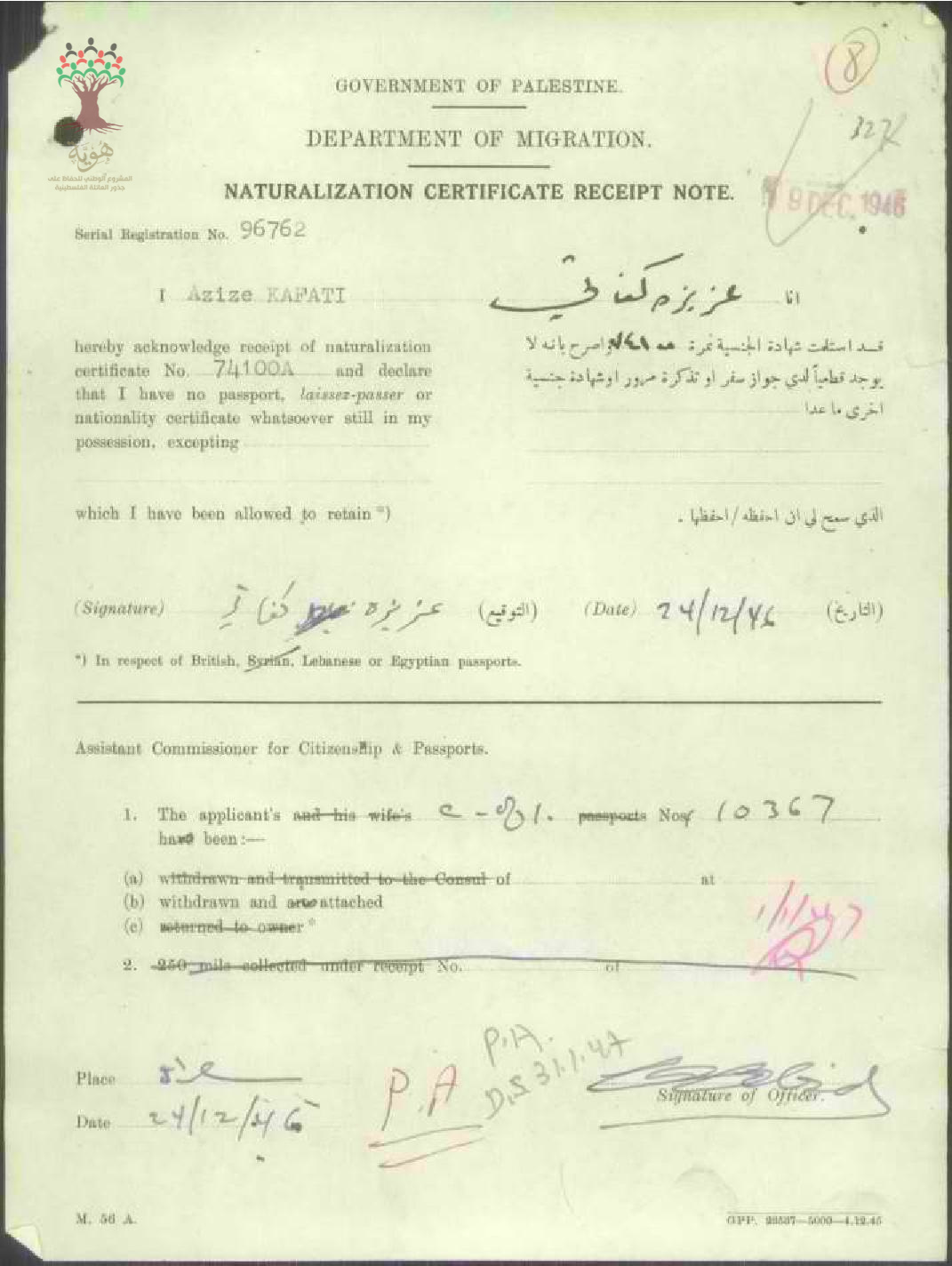 إيصال موقع من عزيزة كفاتي باستلام شهادة الجنسية الفلسطينية