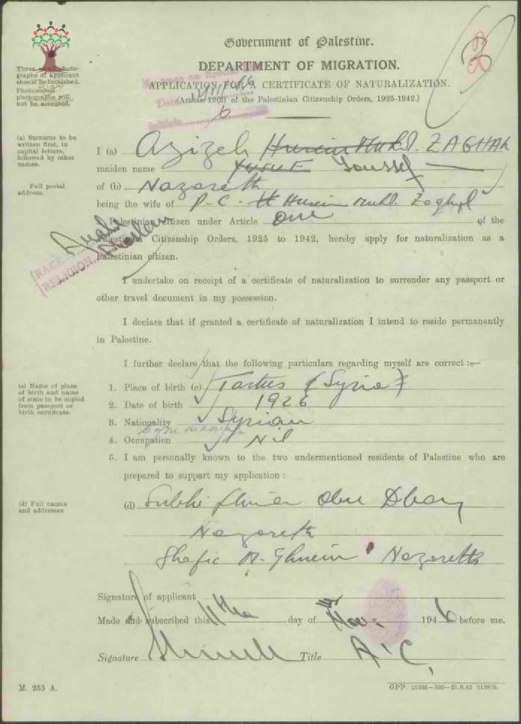 طلب الجنسية الفلسطينية-عزيزة يوسف زغل-الناصرة/سوريا