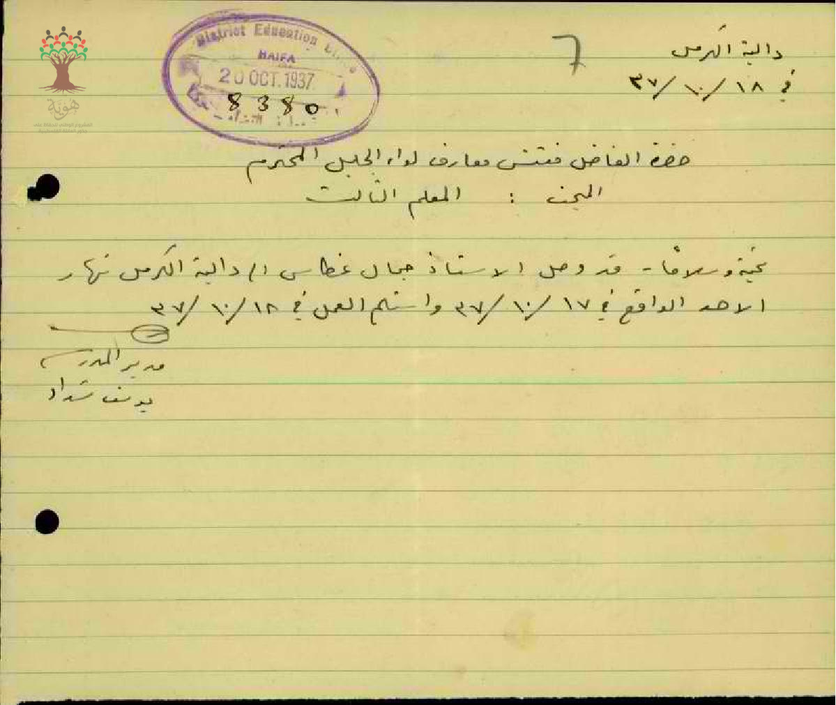 رسالة من مدير مدرسة دالية الكرمل إلى مفتش المعارف يعلمه بوصول المعلم جمال غطاس إلى المدرسة ومباشرة العمل