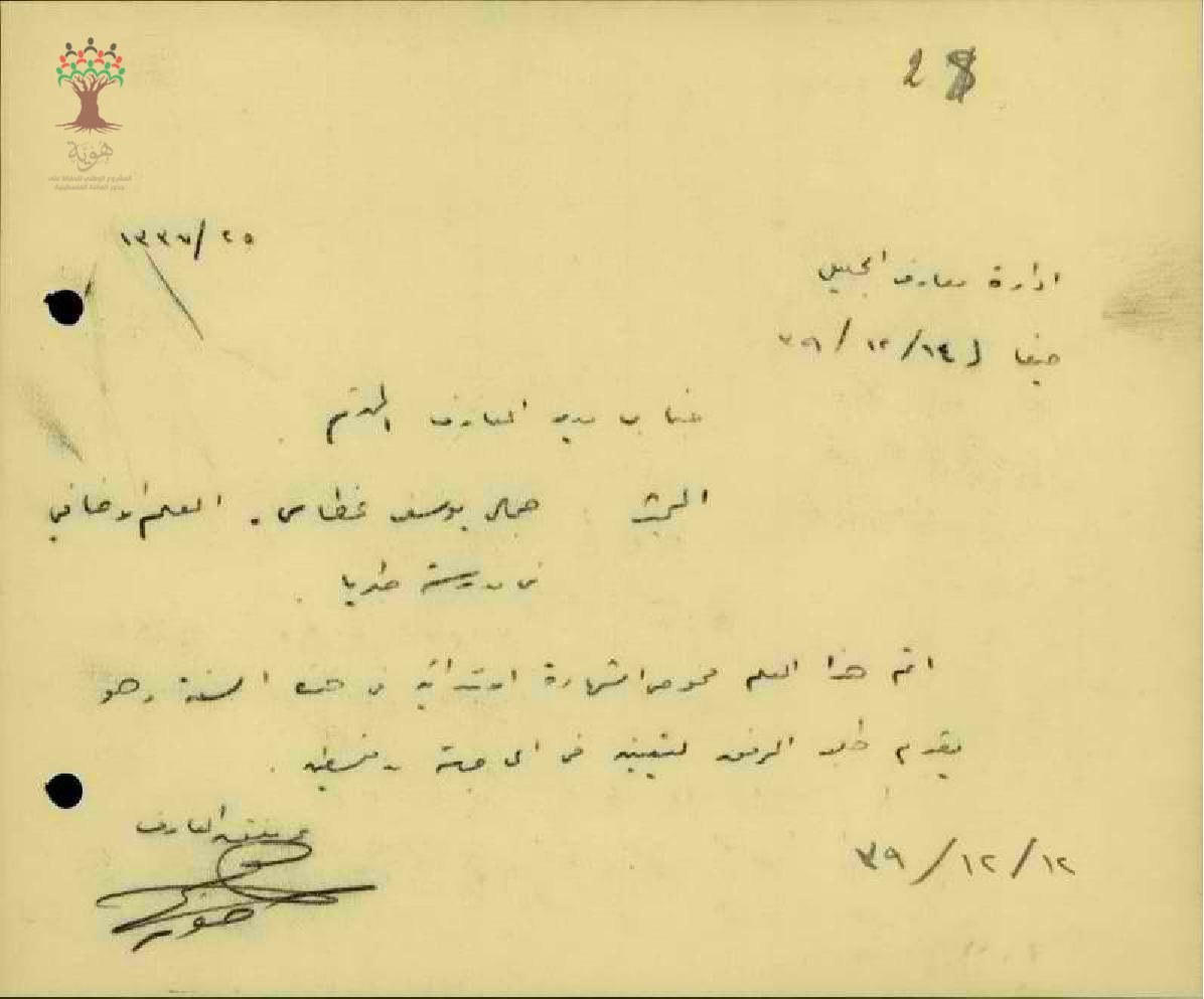 رسالة من مفتش المعارف إلى مدير المعارف يبحث معه أمر اتمام المعلم جمال غطاس فحوص الشهادة الابتدائية