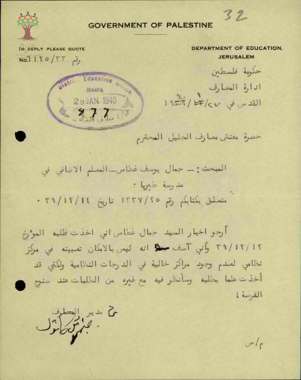رسالة من مدير المعارف إلى مفتش المعارف يخبره بعدم امكانية تعيينه في مركز نظامي لعدم وجود مراكز خالية