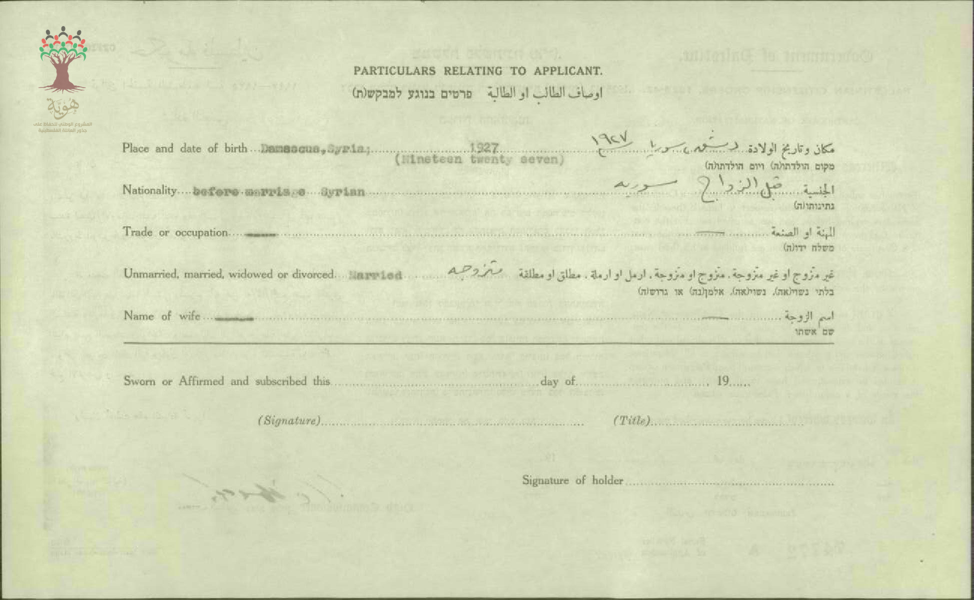 شهادة الجنسية الفلسطينية ل حياة الشريف