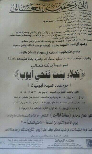 وثيقة وفاة للمرحومة :نجلاء فتحي أيوب