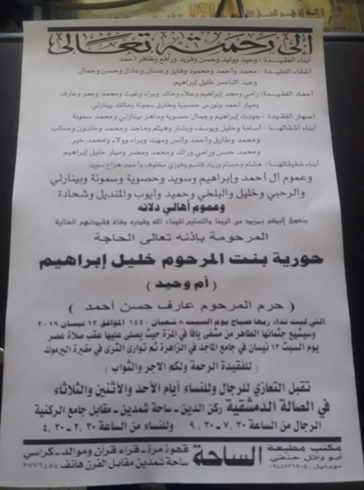 وثيقة وفاة المرحومة: حورية خليل ابراهيم قاسم