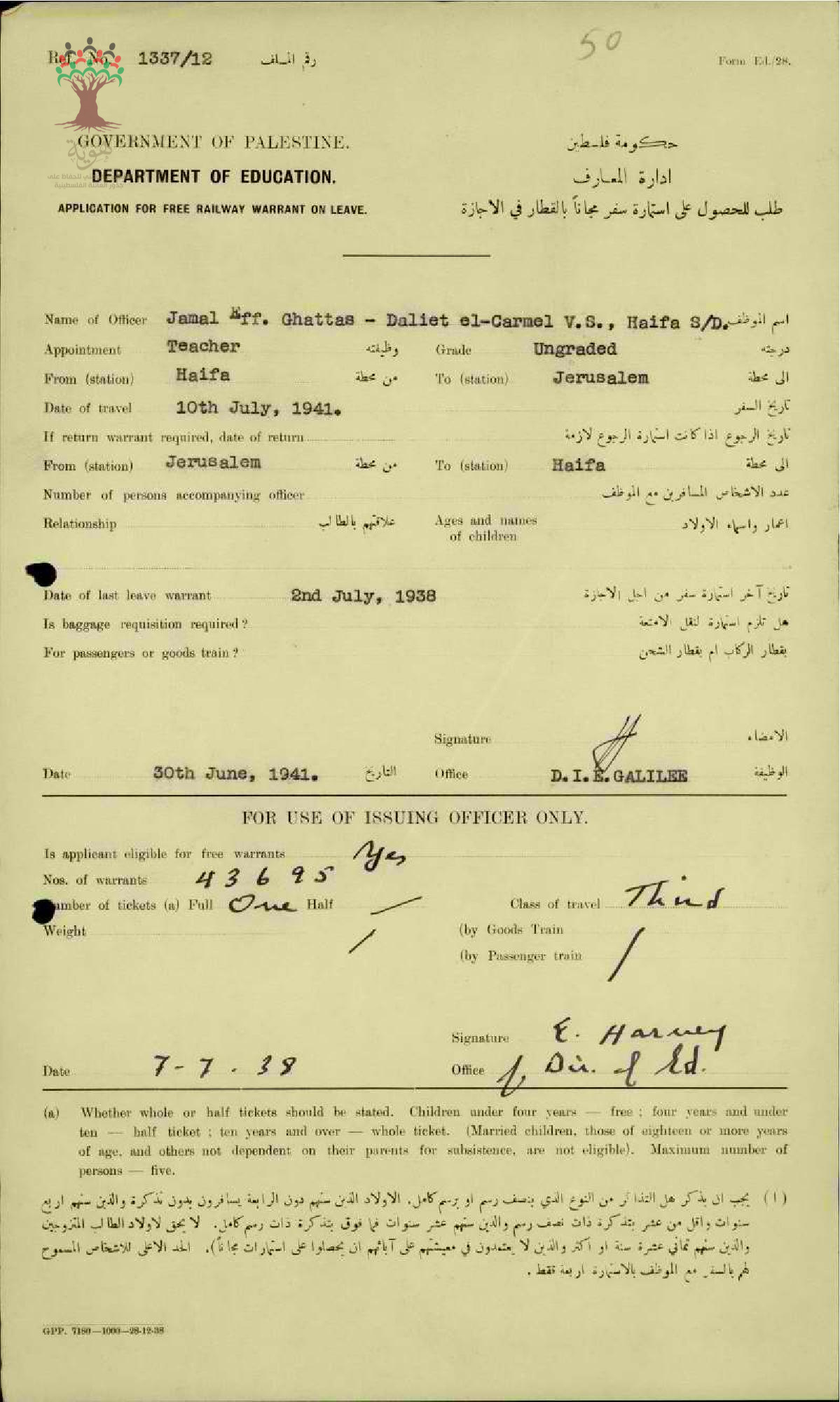طلب للحصول على استمارة سفر مجاناً بالقطار في الإجازة للمعلم جمال غطاس