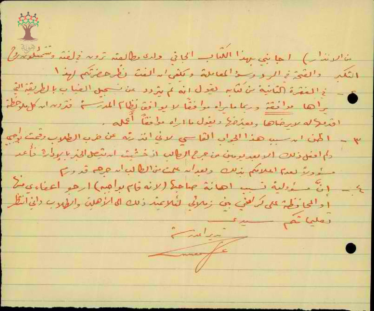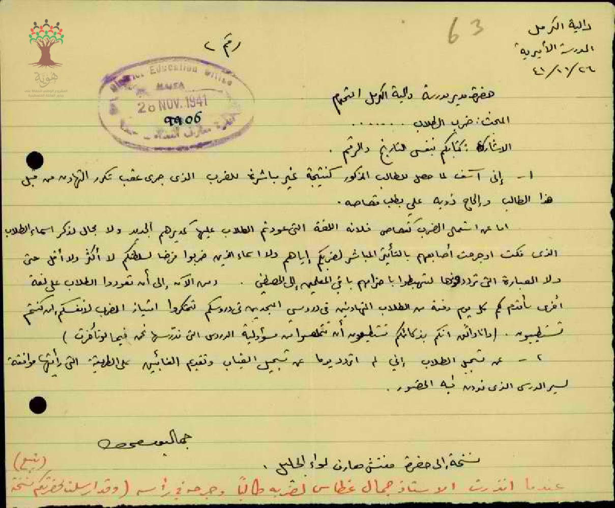 رسالة من المعلم جمال غطاس إلى مدير مدرسة دالية الكرمل يبحث معه أمر ضرب الطلاب و رد مدير المدرسة عليه