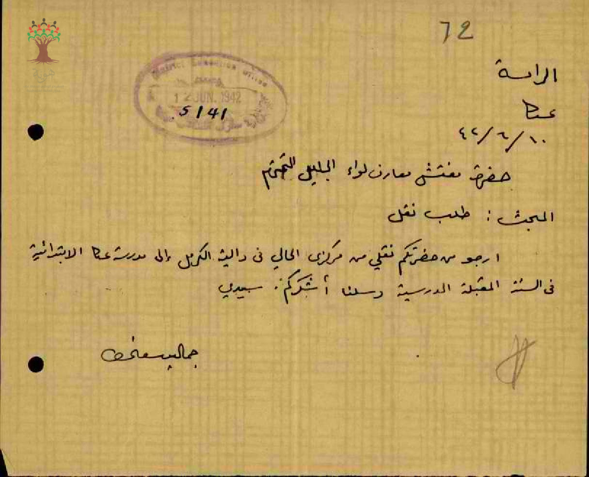 طلب نقل مقدم من المعلم جمال غطاس إلى مفتش المعارف من مدرسة دالية الكرمل إلى مدرسة عكا