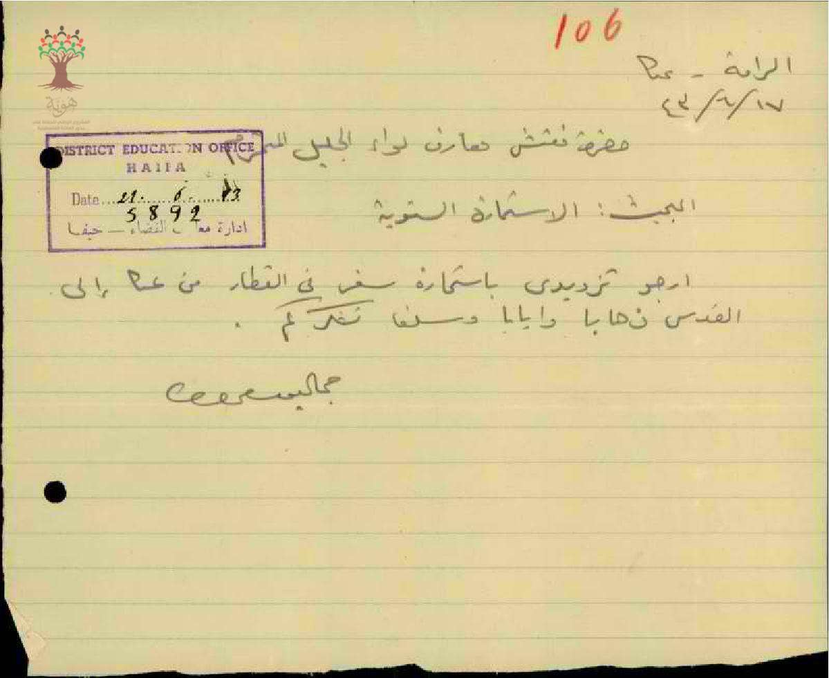 طلب استمارة سفر في القطار مقدم من المعلم جمال غطاس إلى مفتش المعارف