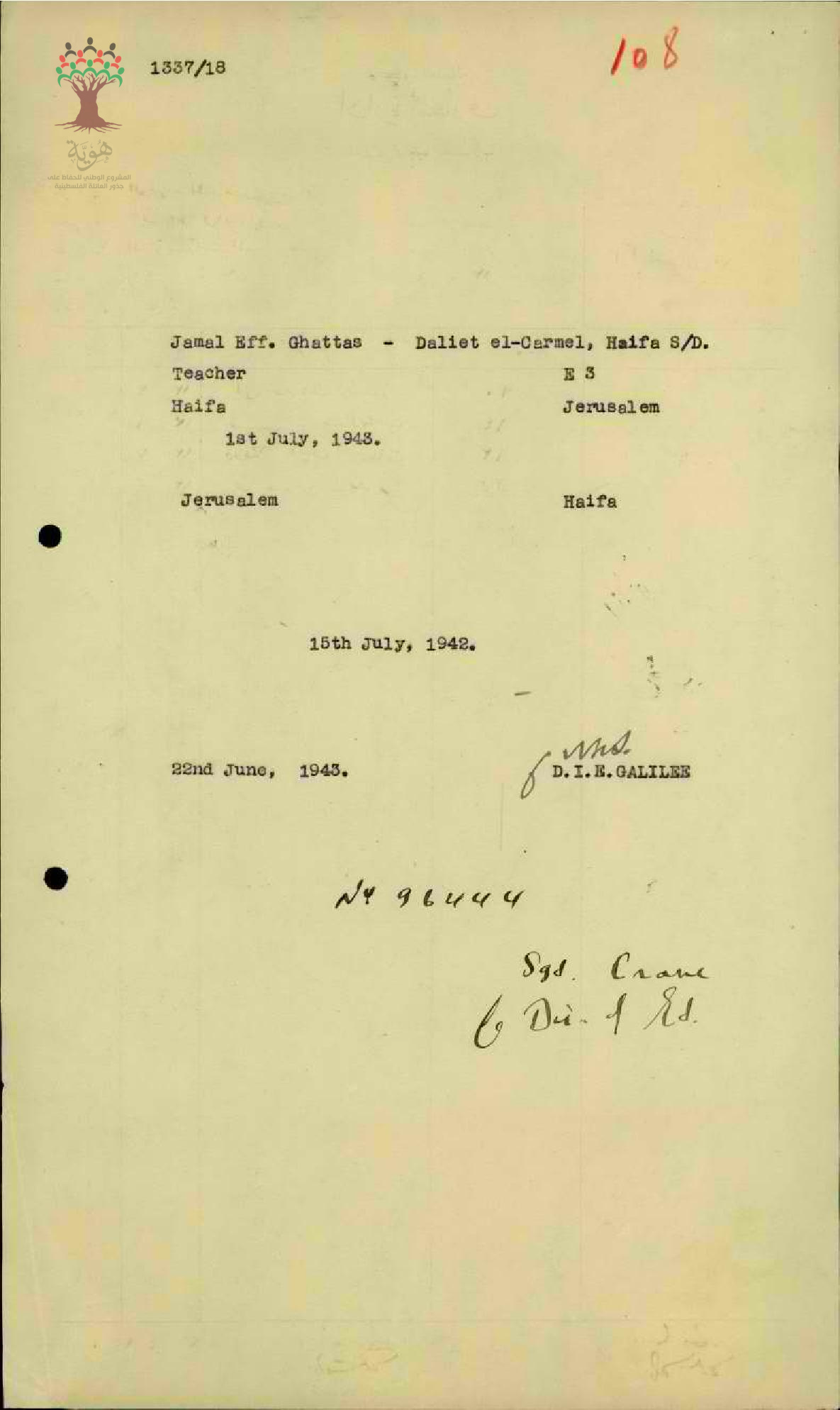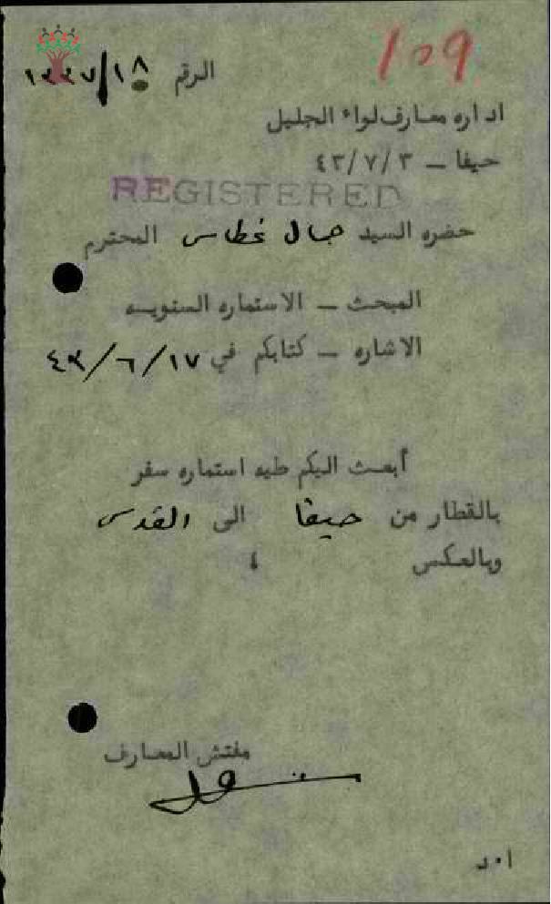 رسالة من مفتش المعارف إلى المعلم جمال غطاس يرسل فيها استمارة سفر بالقطار من حيفا إلى القدس